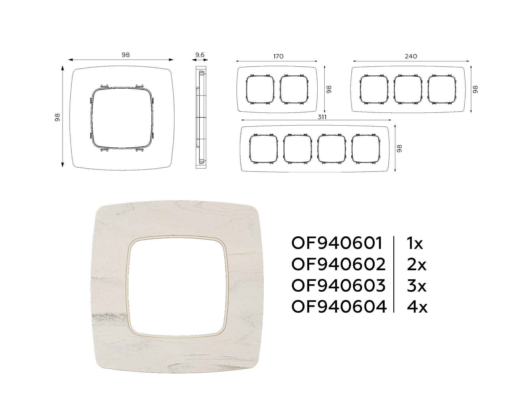 Рамка OMEGA Opera (Серо-бежевый мрамор) 4-ая OF940604. Многогранный ассортимент Ambrella Volt включает в себя механизмы, лицевые панели и рамки, а также комплекты, доступные в различных цветовых решениях. Продукция представлена в модульном исполнении, что позволяет гибко настраивать внешнийвид и функциональность. Вам будет легко заменить лицевую панель, рамку или механизм, найдя идеальное сочетание цветов.
