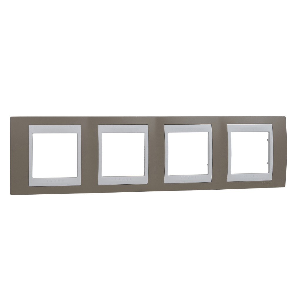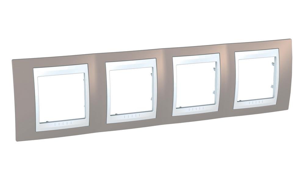 Рамка Schneider Electric UNICA ХАМЕЛЕОН (коричневый) четырёхместная с белой декоративной вставкой.