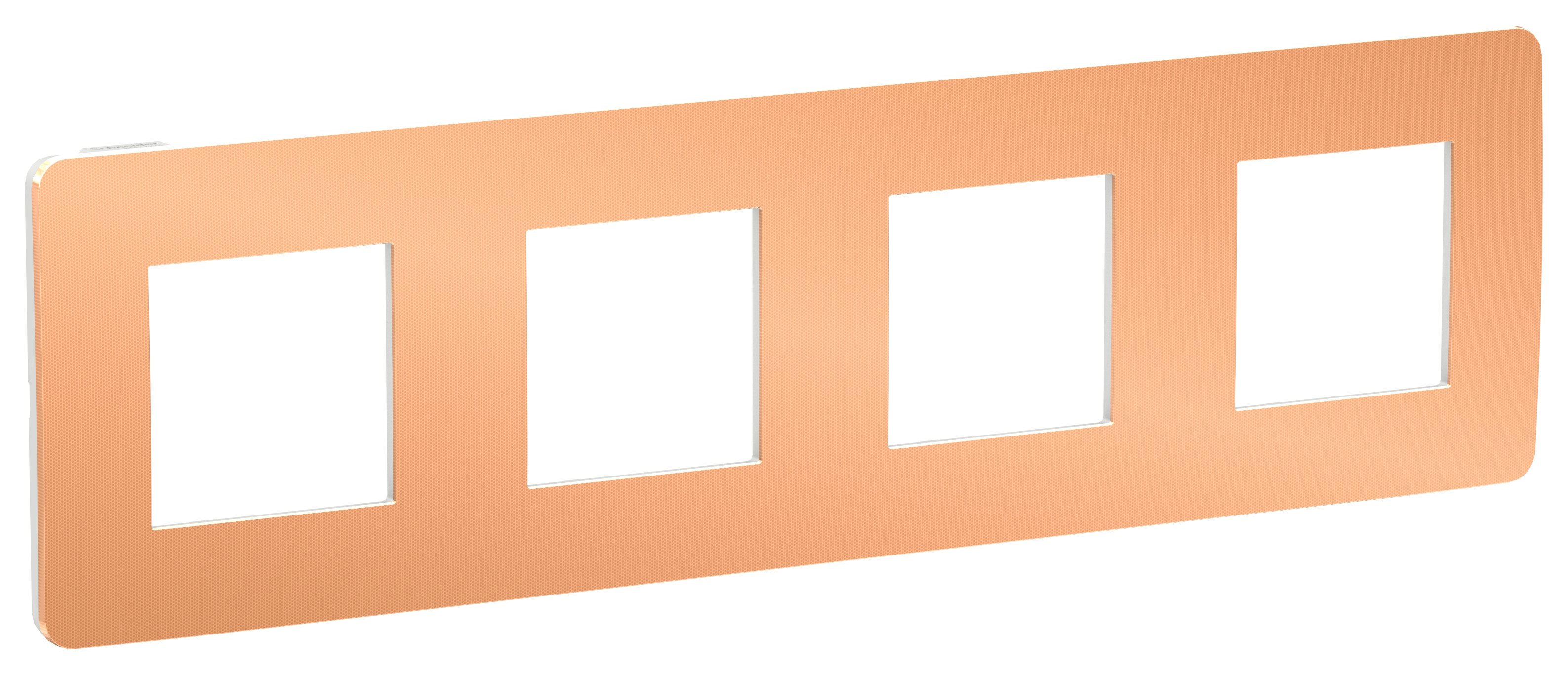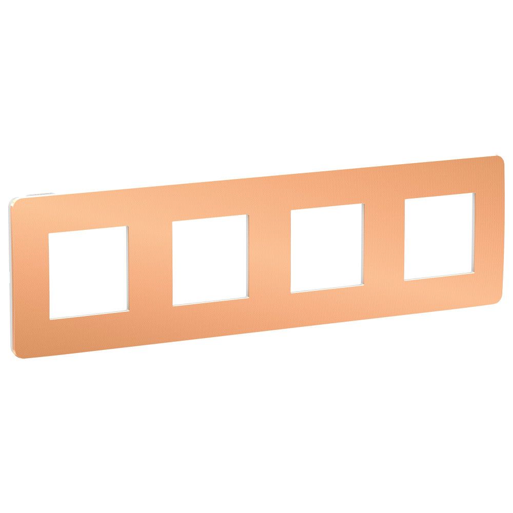 Рамка Schneider Electric UNICA STUDIO Metal (медь) четырёхместная с задней панелью цвета белый.