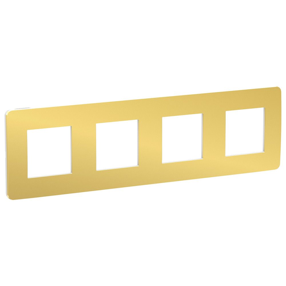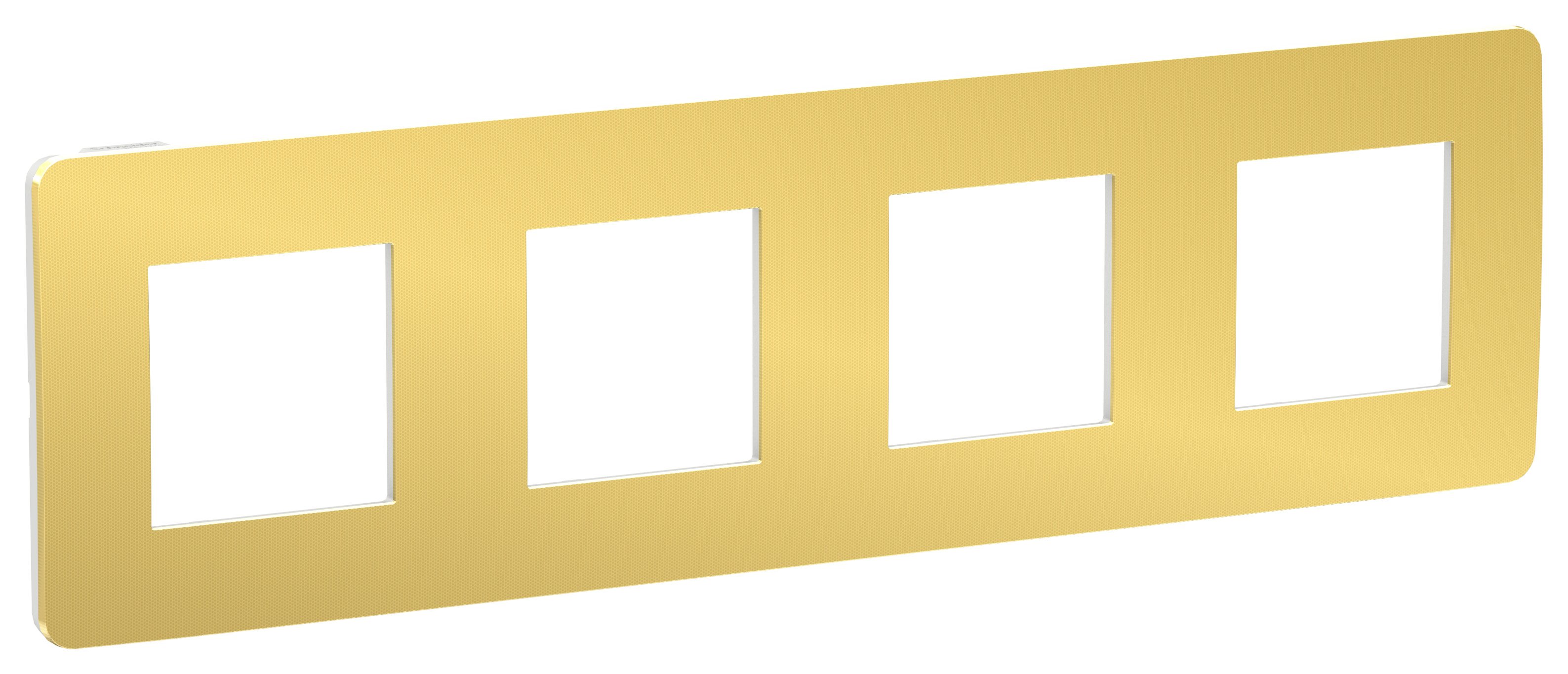 Рамка Schneider Electric UNICA STUDIO Metal (золото) четырёхместная с задней панелью цвета белый.