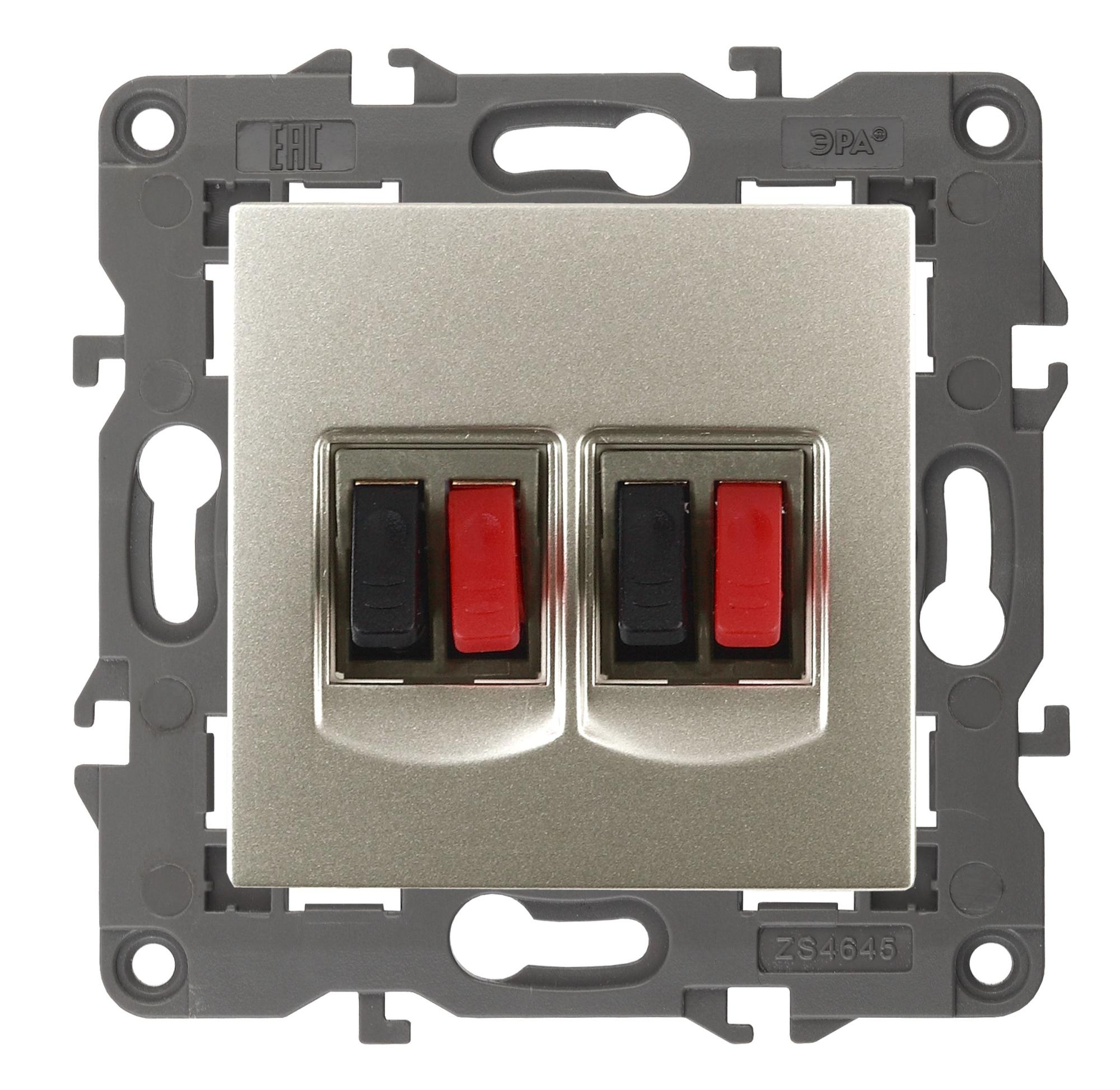 Розетка двойная аудио стерео серии Эра Elegance цвет шампань 14-3112-04. Рамки приобретаются отдельно. Рамки Эра Elegance ПЛАСТИК: 1 пост 14-5001-хх, 2 поста 14-5002-хх, 3 поста 14-5003-хх, 4 поста 14-5004-хх, 5 постов 14-5005-хх; СТЕКЛО: 1 пост 14-5101-хх, 2 поста 14-5102-хх, 3 поста 14-5103-хх, 4 поста 14-5104-хх; МЕТАЛЛ: 1 пост 14-5201-хх, 2 поста 14-5202-хх, 3 поста 14-5203-хх, 4 поста 14-5204-хх; ДЕРЕВО: 1 пост 14-5301-хх, 2 поста 14-5302-хх, 3 поста 14-5303-хх, 4 поста 14-5304-хх (хх - код цвета: 00-прозрачный, 01-белый, белёный дуб, 02-слоновая кость, 03-алюминий, 04-шампань, 05-чёрный, чёрное дерево, 07-ясень, 09-дуб, 10-венге, 11-клён, 14-медь, 21-жёлтый, 22-оранжевый, 23-красный, 25-бордо, 26-лайм, 27-зелёный, 28-голубой, 29-синий, 30-розовый, 31-мокко, 32-серый, 41-сталь, 42-титан).