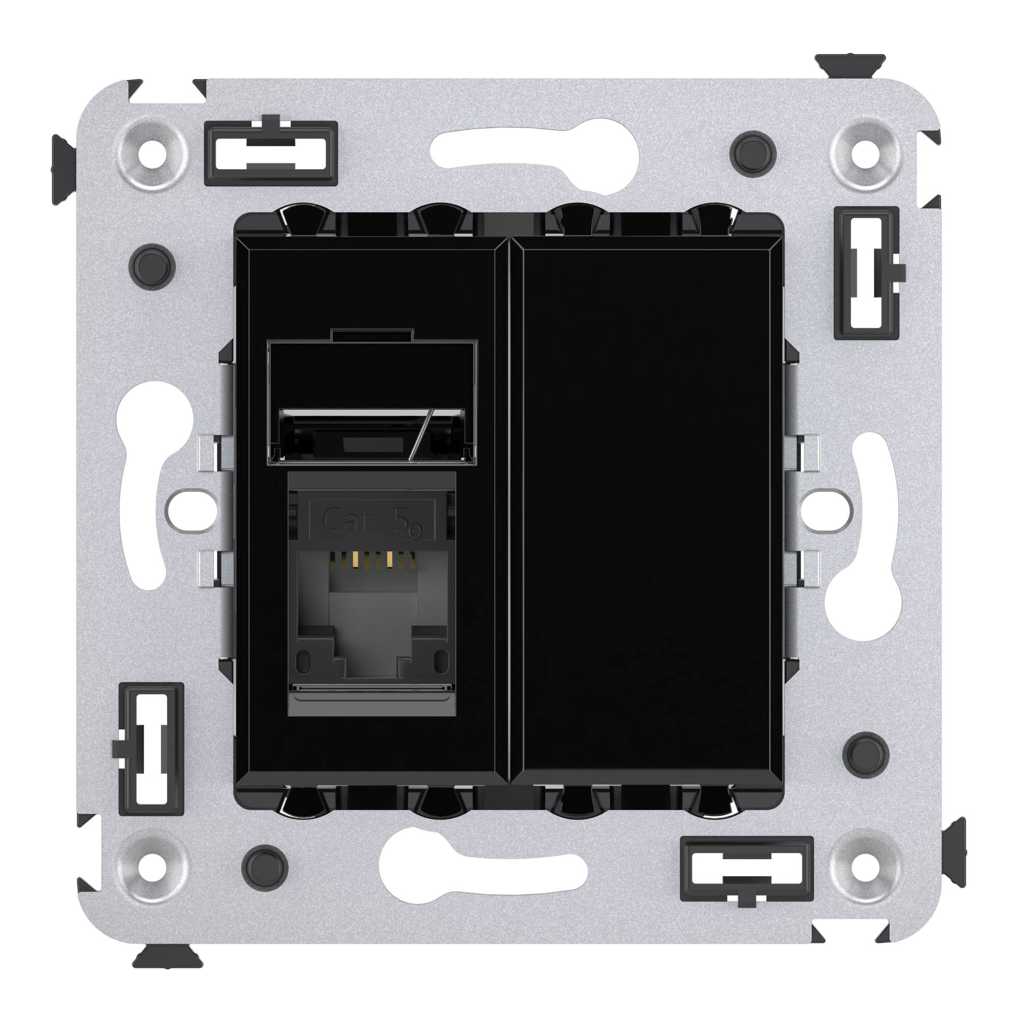 Компьютерная розетка двойная используется для подключения компьютерной техники или же соединения с патч-панелью. Компьютерная розетка предназначена для скрытого монтажа в стену. Розетка RJ-45 категории 5e – это наиболее популярная на сегодняшний день модель. Она позволяет организовать сеть с частотой 125 МГц и скоростью до 1000 Мбит/с. Материал – металл, термопласт. Пластиковые части устройства имеют оттенок "Черный квадрат" – самый глубокий, таинственный и многогранный оттенок из всей палитры цветовых решений "Avanti".