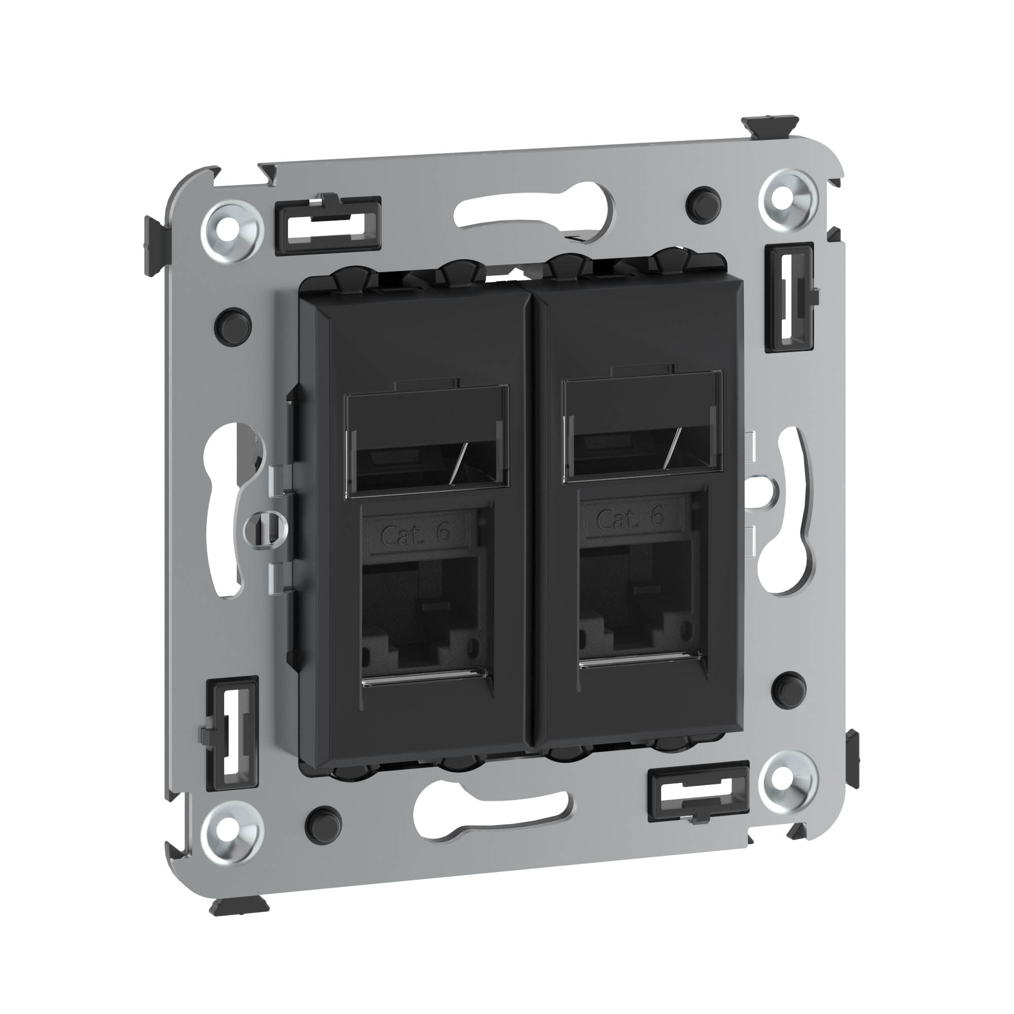 Компьютерная розетка RJ-45 в стену, двойная. Категория: 6А. Предназначена для монтажа в подрозеточные коробки глубиной не менее 45 мм (код 59301). Используется для подключения сетевого кабеля к рабочему месту. Характеристики: 8P8C; с пылезащитной шторкой; с маркировочной табличкой. Заделка не требует инструмента. 2 модуля. Цвет: "Черный матовый".