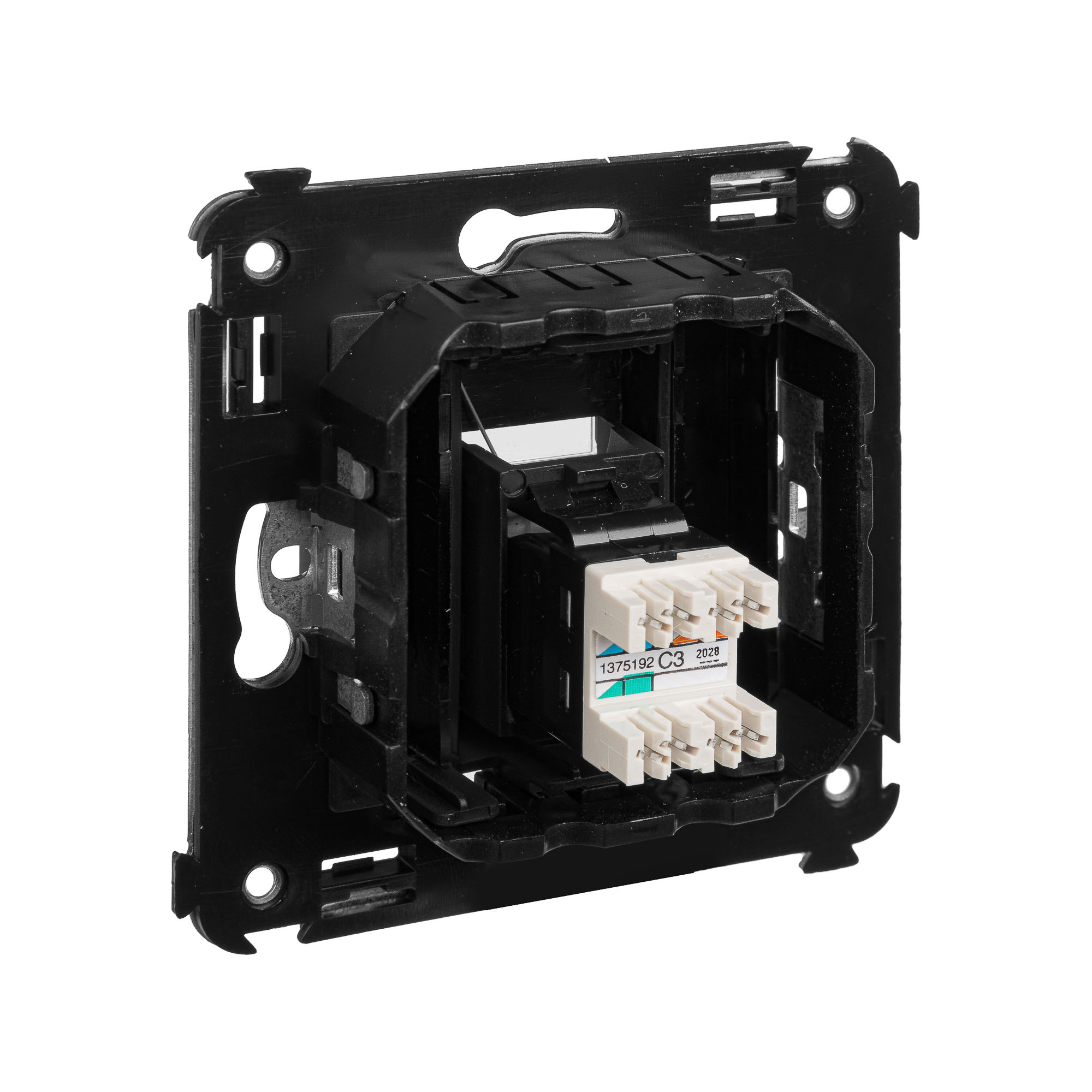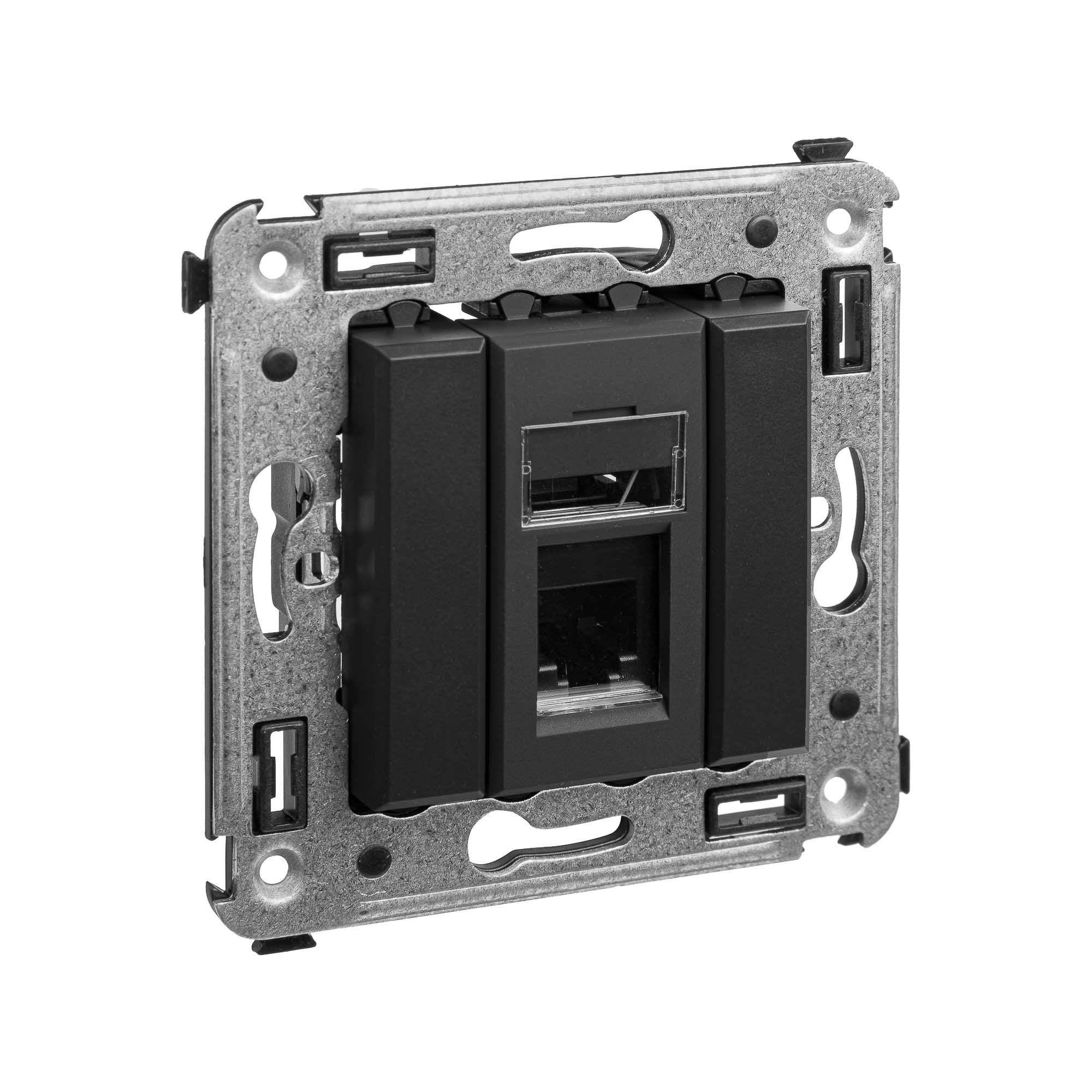 Телефонная розетка одинарная RJ-12 для монтажа в стену. Предназначена для монтажа в подрозеточные коробки глубиной не менее 45 мм (код 59301). Используется для подключения телефонного кабеля к рабочему месту. 6P6C. С пылезащитной шторкой, маркировочной табличкой. В комплекте разъем Keystone. Для заделки контактов используется инструмент типа 110. 2 модуля. Цвет: "Черный матовый".