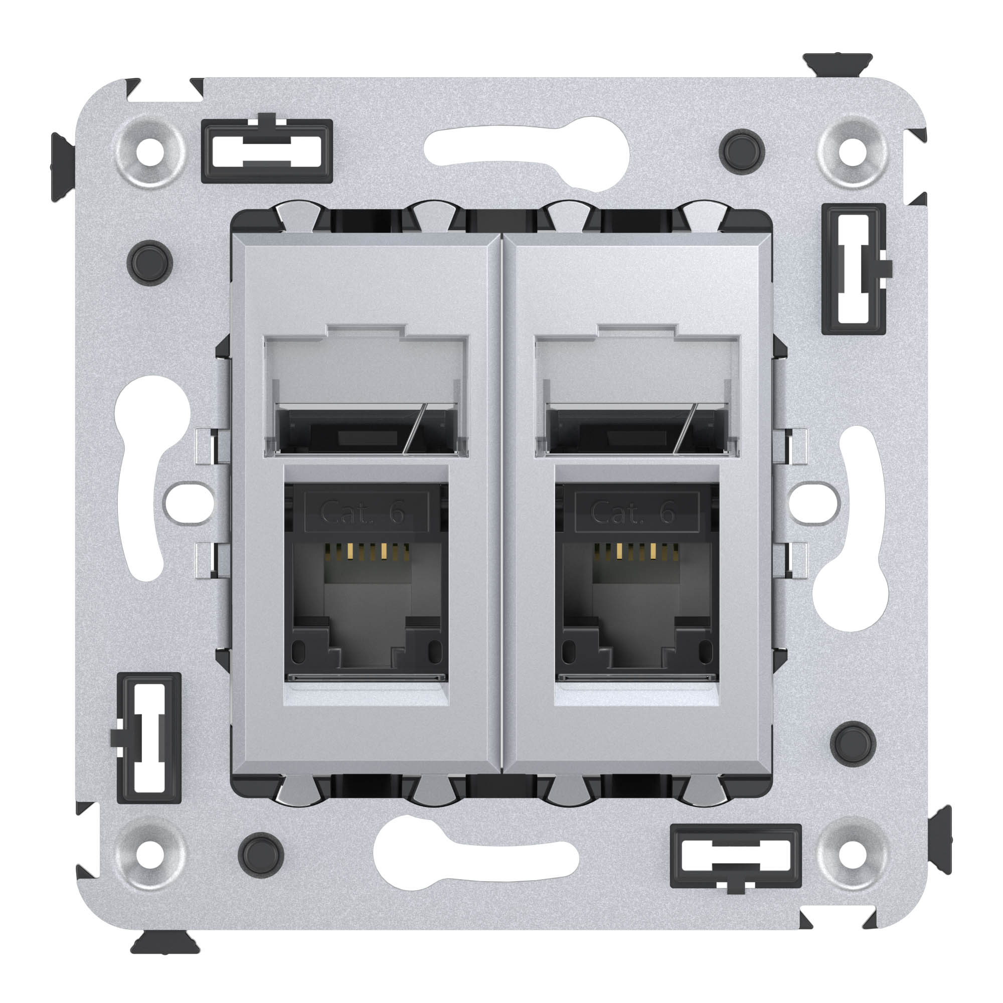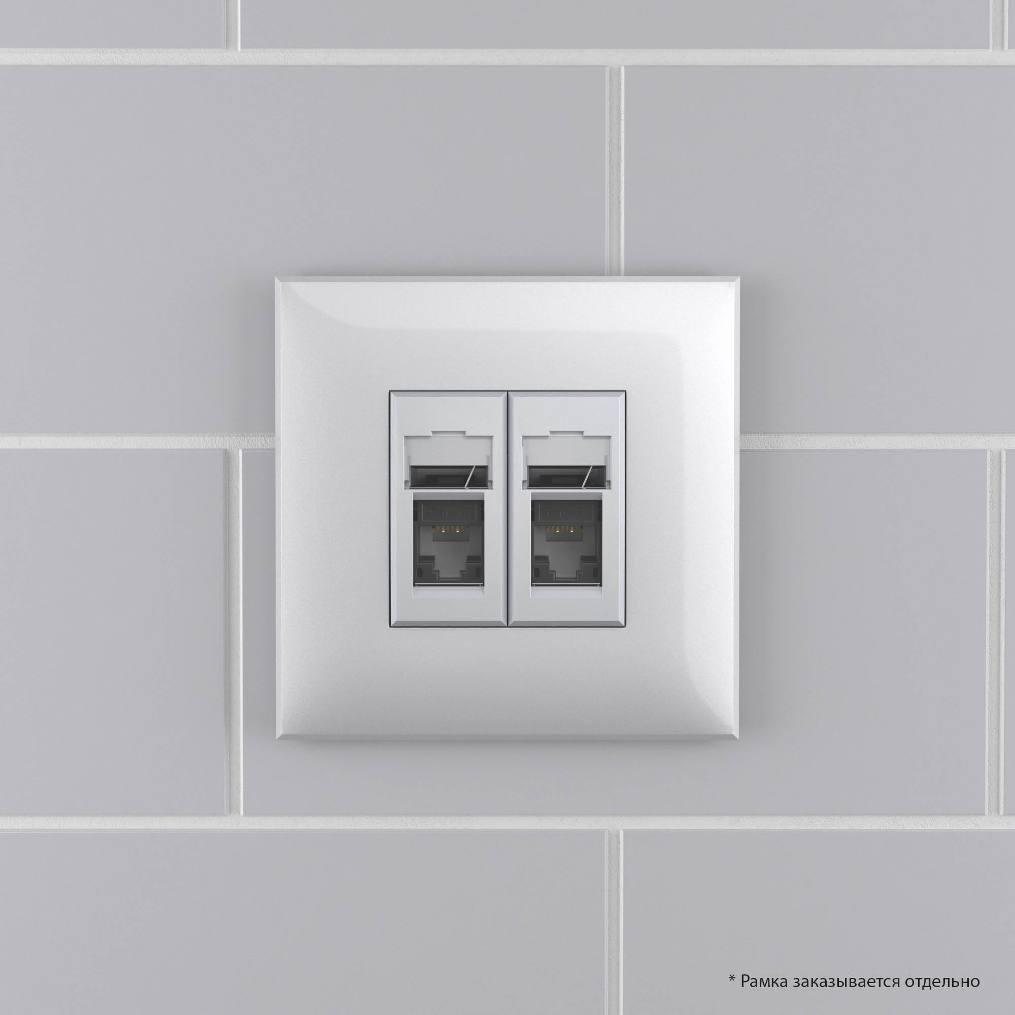 Компьютерная розетка двойная RJ-45 для монтажа в стену. Назначение: для монтажа в подрозеточные коробки глубиной не менее 45 мм (код 59301); подключение сетевого кабеля к рабочему месту. Характеристики: 8P8C; с пылезащитной шторкой; с маркировочной табличкой; в комплекте разъем Keystone; заделка без инструмента. Категория: 6. Кол-во модулей: 2. Цвет: "Закаленная сталь"