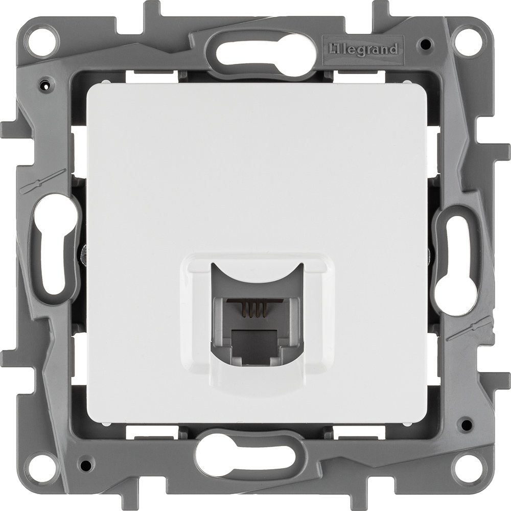 Розетка телефонная RJ11 Legrand Etika,для скрытого монтажа, цвет белый. Служит для быстрого подключения к сетям телекоммуникаций (например, к телефонным сетям общего пользования).