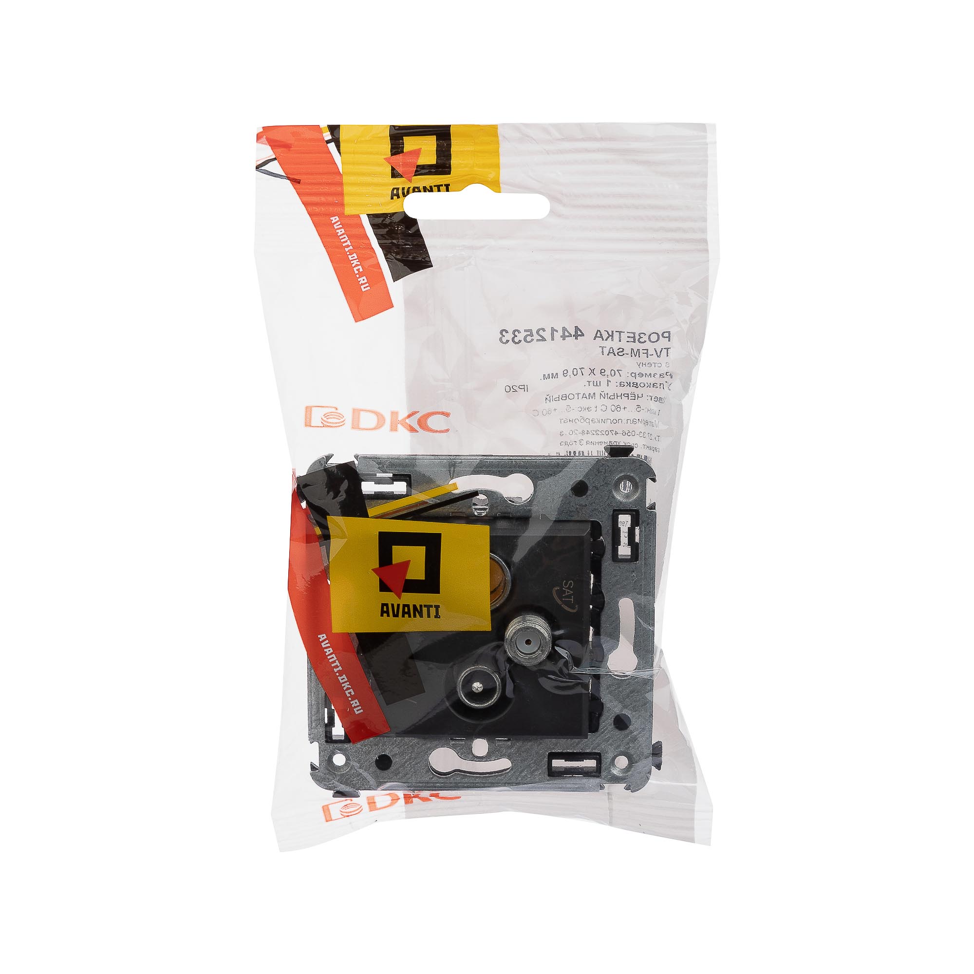 Розетка TV-FM-SAT. Назначение: для монтажа в подрозеточные коробки глубиной не менее 45 мм (код 59301). Используется для подключения телевизионного, спутникового телевизионного и радио- кабеля к телевизору. Характеристики: винтовые зажимы; диапазон рабочих частот 4–2400 МГц; затухание