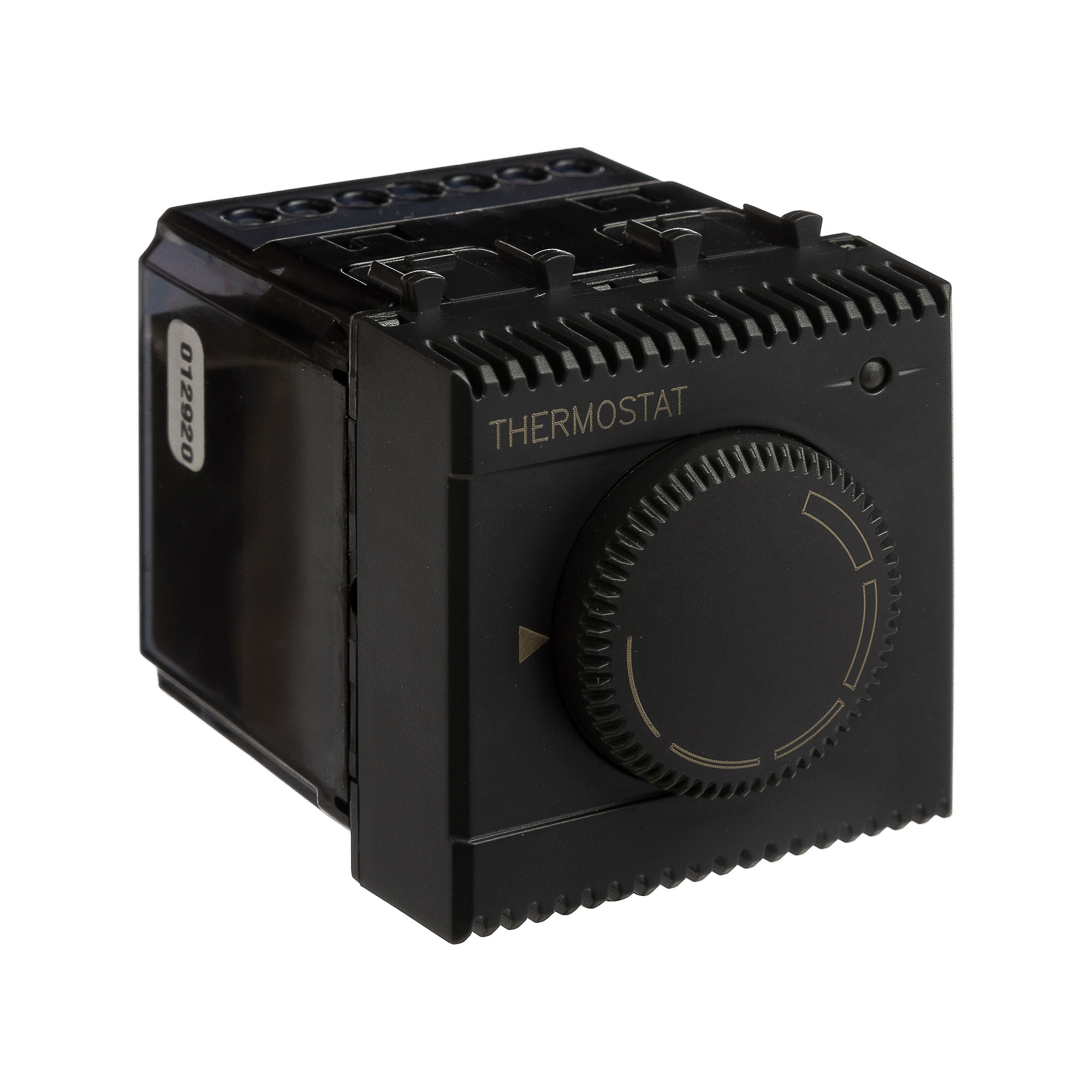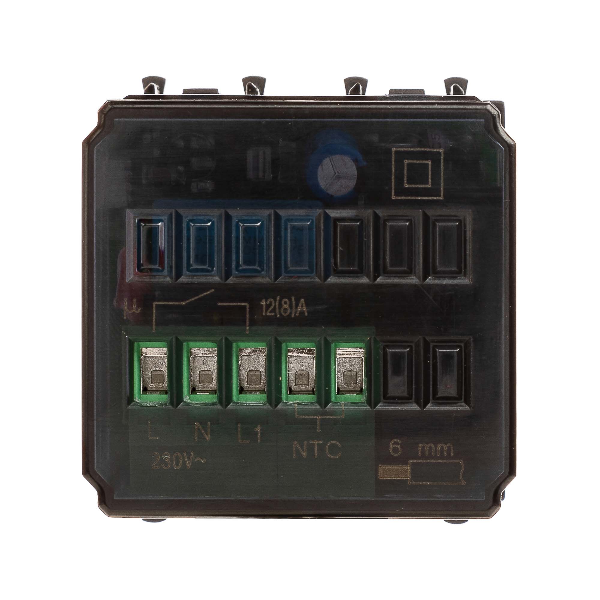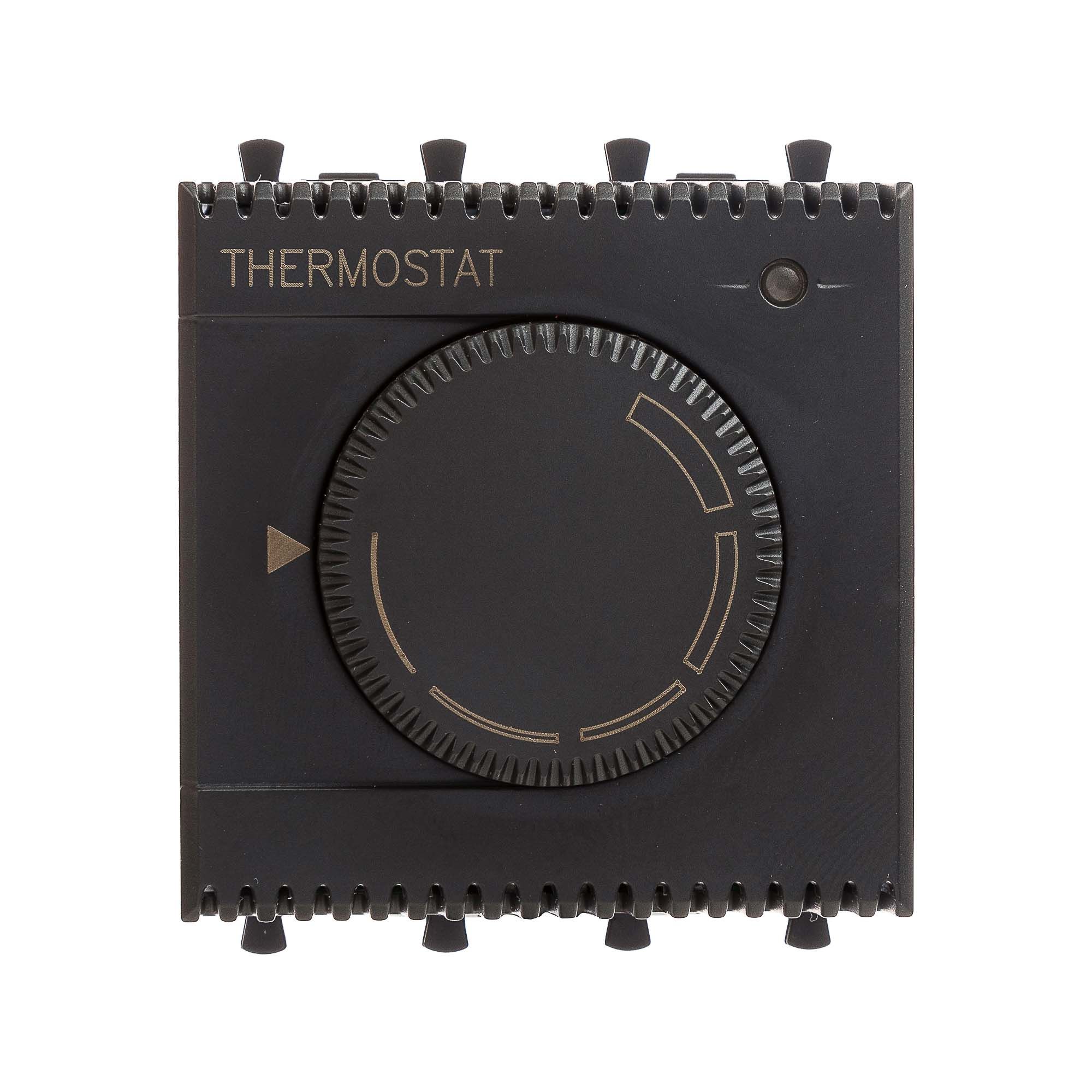 Термостат модульный для теплых полов. Назначение: для монтажа в системы "In-liner Front" и "In-liner Aero" при помощи рамок-суппортов и каркасов "Avanti" (код 4400912 и т.д.). Используется для управления теплыми полами. Характеристики: диапазон от 5 до 30 °С; частота – 50–60 Гц; номинальное напряжение – 230 В; лампа-индикатор включается, когда температура в комнате падает ниже выбранного значения; нагрузка: 5 A – cosφ=1, 2 A – cosφ=0,4. Фиксация производится в подрозеточные коробки глубиной не менее 45 мм при помощи каркаса с лапками (код 4400802) и саморезов. 2 модуля. Цвет: "Черый матовый".