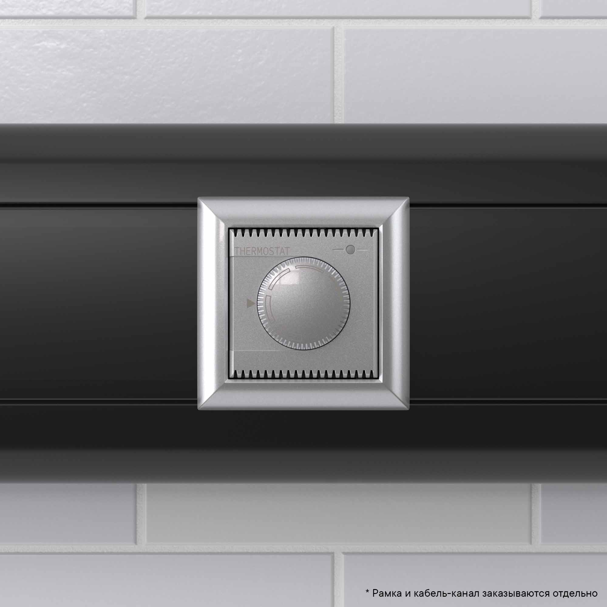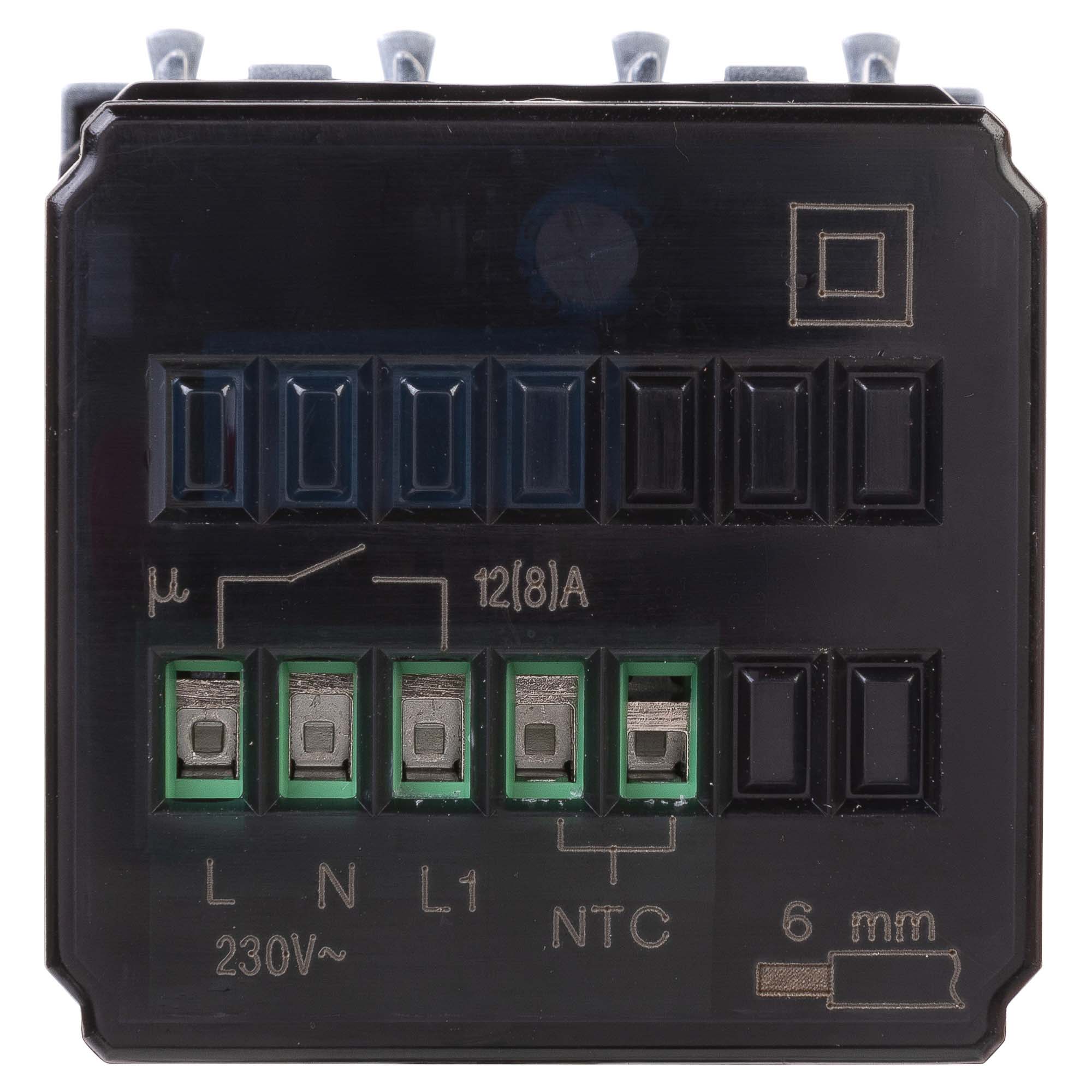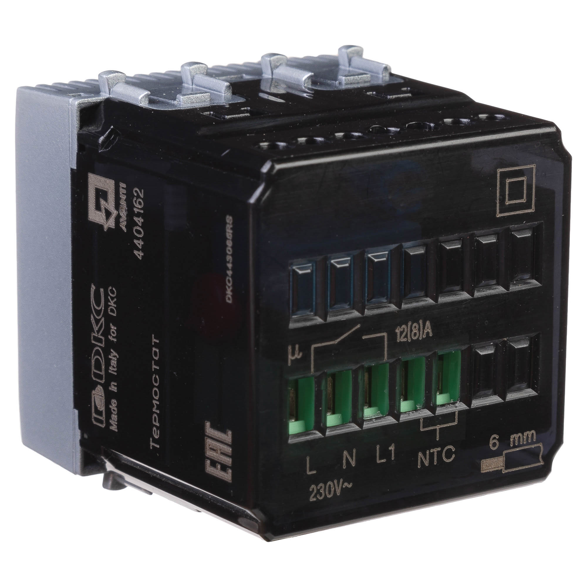 Термостат модульный для теплых полов. Назначение: для монтажа в системы "In-liner Front" и "In-liner Aero" при помощи рамок-суппортов и каркасов "Avanti" (код 4400912 и т.д.); управление теплыми полами. Характеристики: диапазон от 5 до 30 °С; частота – 50–60 Гц; номинальное напряжение – 230 В; лампа-индикатор включается, когда температура в комнате падает ниже выбранного значения; нагрузка: 5 A – cosφ=1, 2 A – cosφ=0,4; фиксация в подрозеточные коробки глубиной не менее 45 мм при помощи каркаса с лапками (код 4400802) и саморезов. Кол-во модулей: 2. Цвет: "Закаленная сталь"