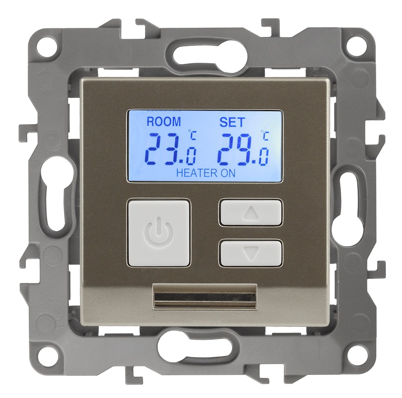 Терморегулятор теплый пол / отопление электронный серии Эра 12 СУ механизм цвет шампань 12-4111-04. Номинальные характеристики 16А 230В. Сделана из поликарбоната. Монтаж в подрозетник производится и на лапки, и на винты. Рамки приобретаются отдельно. Рамки Эра 12: 1 пост 12-5001-хх, 2 поста 12-5002-хх, 3 поста 12-5003-хх, 4 поста 12-5004-хх, 5 постов 12-5005-хх. Рамки Эра 12 Сатин: 1 пост 12-5101-хх, 2 поста 12-5102-хх, 3 поста 12-5103-хх, 4 поста 12-5104-хх, 5 постов - 12-5105-хх (хх - код цвета: 01-белый, 02-слоновая кость, 03-алюминий, 04-шампань, 05-антрацит, 06-чёрный, 07-ольха(белёный дуб-сатин), 08-вишня, 09-дуб, 10-венге, 11-сосна, 21-жёлтый, 22-оранжевый, 23-красный, 24-охра, 25-бордо, 26-лайм, 27-зелёный, 28-голубой, 29-синий).