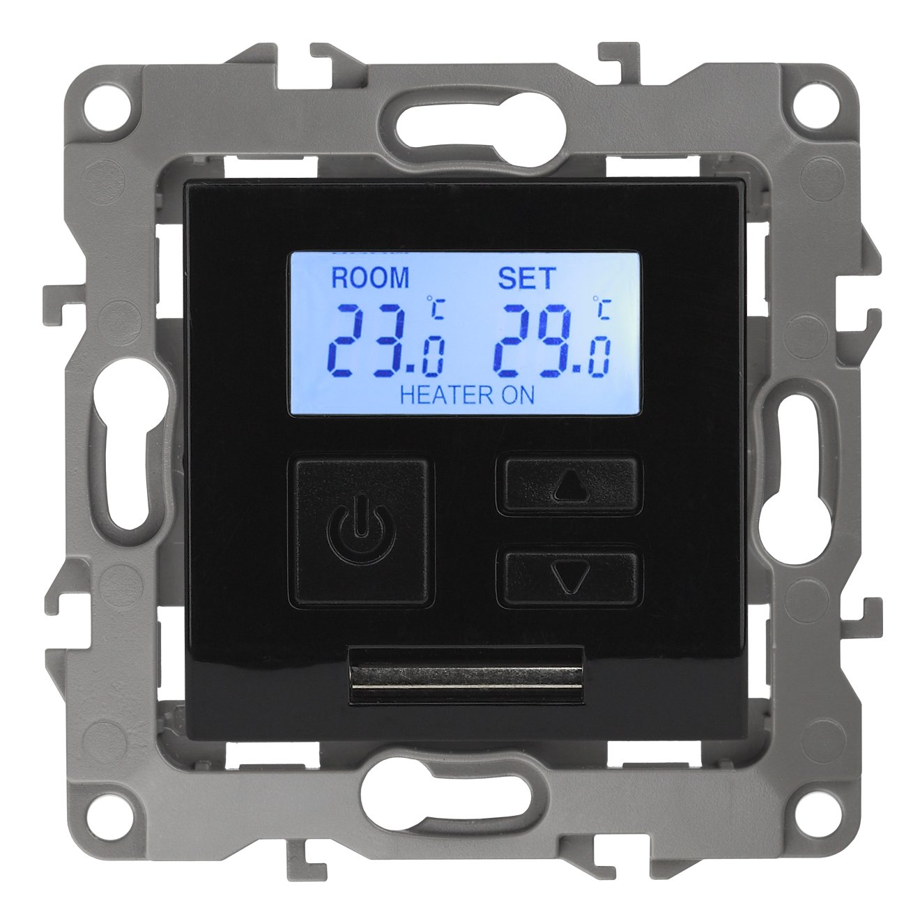 Терморегулятор теплый пол / отопление электронный серии Эра 12 СУ механизм цвет чёрный 12-4111-06. Номинальные характеристики 16А 230В. Сделана из поликарбоната. Монтаж в подрозетник производится и на лапки, и на винты. Рамки приобретаются отдельно. Рамки Эра 12: 1 пост 12-5001-хх, 2 поста 12-5002-хх, 3 поста 12-5003-хх, 4 поста 12-5004-хх, 5 постов 12-5005-хх. Рамки Эра 12 Сатин: 1 пост 12-5101-хх, 2 поста 12-5102-хх, 3 поста 12-5103-хх, 4 поста 12-5104-хх, 5 постов - 12-5105-хх (хх - код цвета: 01-белый, 02-слоновая кость, 03-алюминий, 04-шампань, 05-антрацит, 06-чёрный, 07-ольха(белёный дуб-сатин), 08-вишня, 09-дуб, 10-венге, 11-сосна, 21-жёлтый, 22-оранжевый, 23-красный, 24-охра, 25-бордо, 26-лайм, 27-зелёный, 28-голубой, 29-синий).