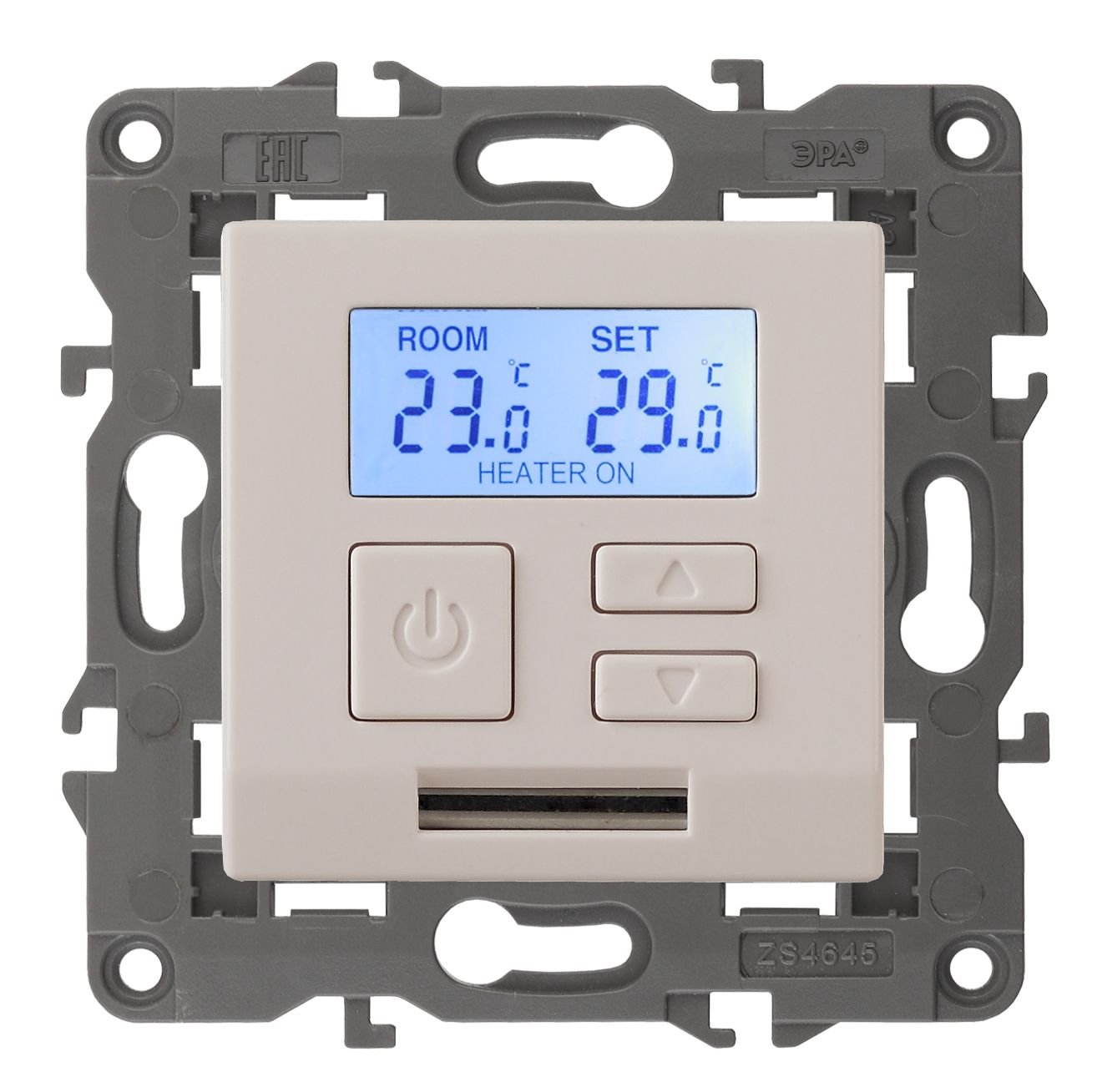 Терморегулятор теплый пол / отопление электронный серии Эра Elegance цвет слоновая кость 14-4111-02. Рамки приобретаются отдельно. Рамки Эра Elegance ПЛАСТИК: 1 пост 14-5001-хх, 2 поста 14-5002-хх, 3 поста 14-5003-хх, 4 поста 14-5004-хх, 5 постов 14-5005-хх; СТЕКЛО: 1 пост 14-5101-хх, 2 поста 14-5102-хх, 3 поста 14-5103-хх, 4 поста 14-5104-хх; МЕТАЛЛ: 1 пост 14-5201-хх, 2 поста 14-5202-хх, 3 поста 14-5203-хх, 4 поста 14-5204-хх; ДЕРЕВО: 1 пост 14-5301-хх, 2 поста 14-5302-хх, 3 поста 14-5303-хх, 4 поста 14-5304-хх (хх - код цвета: 00-прозрачный, 01-белый, белёный дуб, 02-слоновая кость, 03-алюминий, 04-шампань, 05-чёрный, чёрное дерево, 07-ясень, 09-дуб, 10-венге, 11-клён, 14-медь, 21-жёлтый, 22-оранжевый, 23-красный, 25-бордо, 26-лайм, 27-зелёный, 28-голубой, 29-синий, 30-розовый, 31-мокко, 32-серый, 41-сталь, 42-титан).