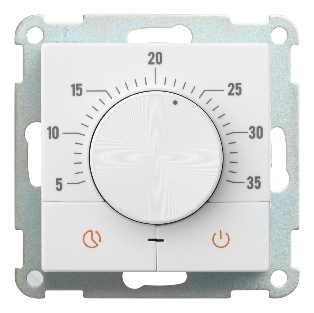 Поворотный термостат для теплого пола белого цвета, 250 В, 16 А, датчик теплого пола в комплекте. устанавливается в стандартный подрозетник. Для установки в рамку необходимо использовать адаптер - арт. 32881.