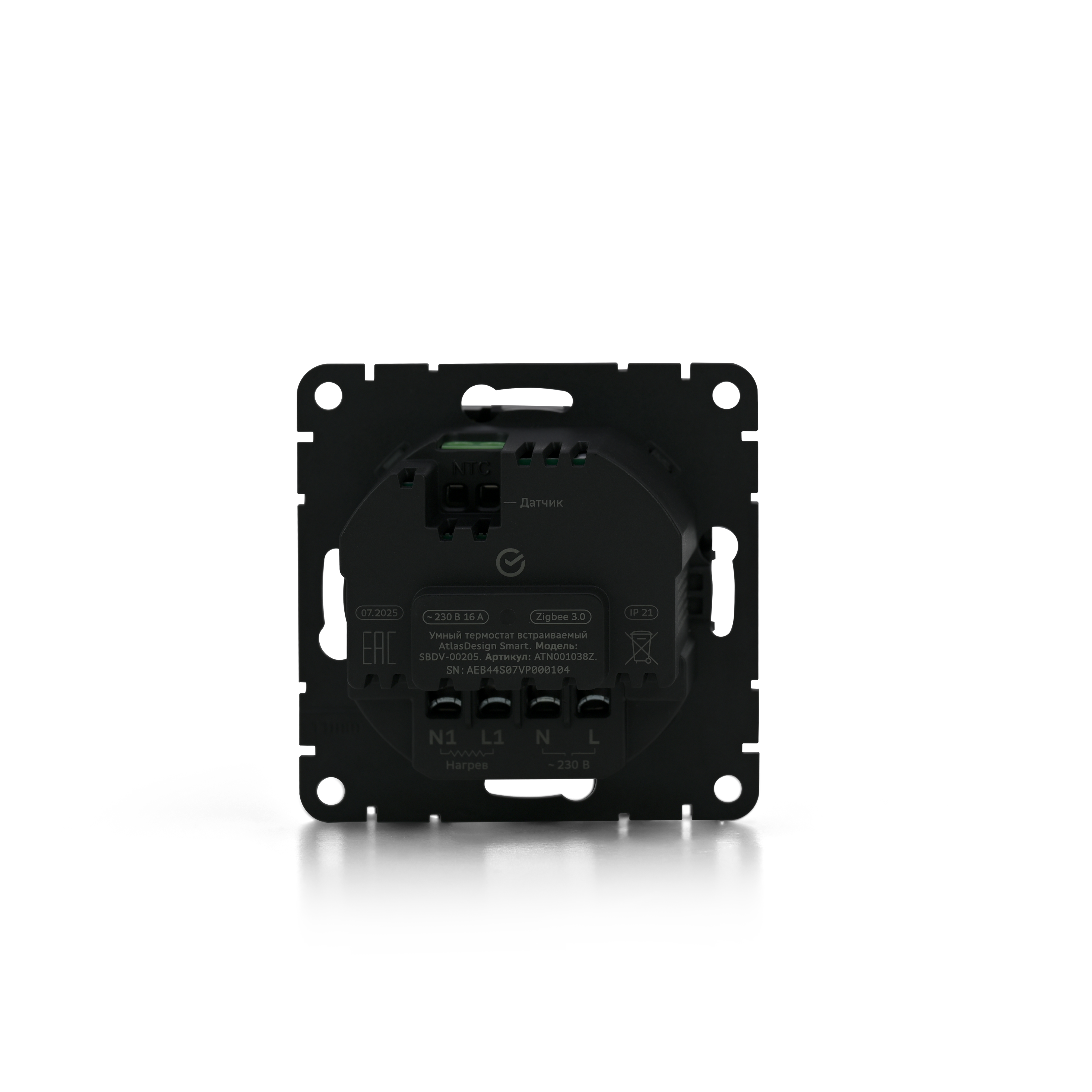 Встраиваемый термостат для теплого пола — умное Zigbee-устройство для поддержания комфортной температуры в доме. Он входит в линейку AtlasDesign Smart и совместим с рамками AtlasDesign от Systeme Electric. Устанавливается в стандартный подрозетник глубиной от 45 мм и монтируется отдельно или в многопостовые рамки.