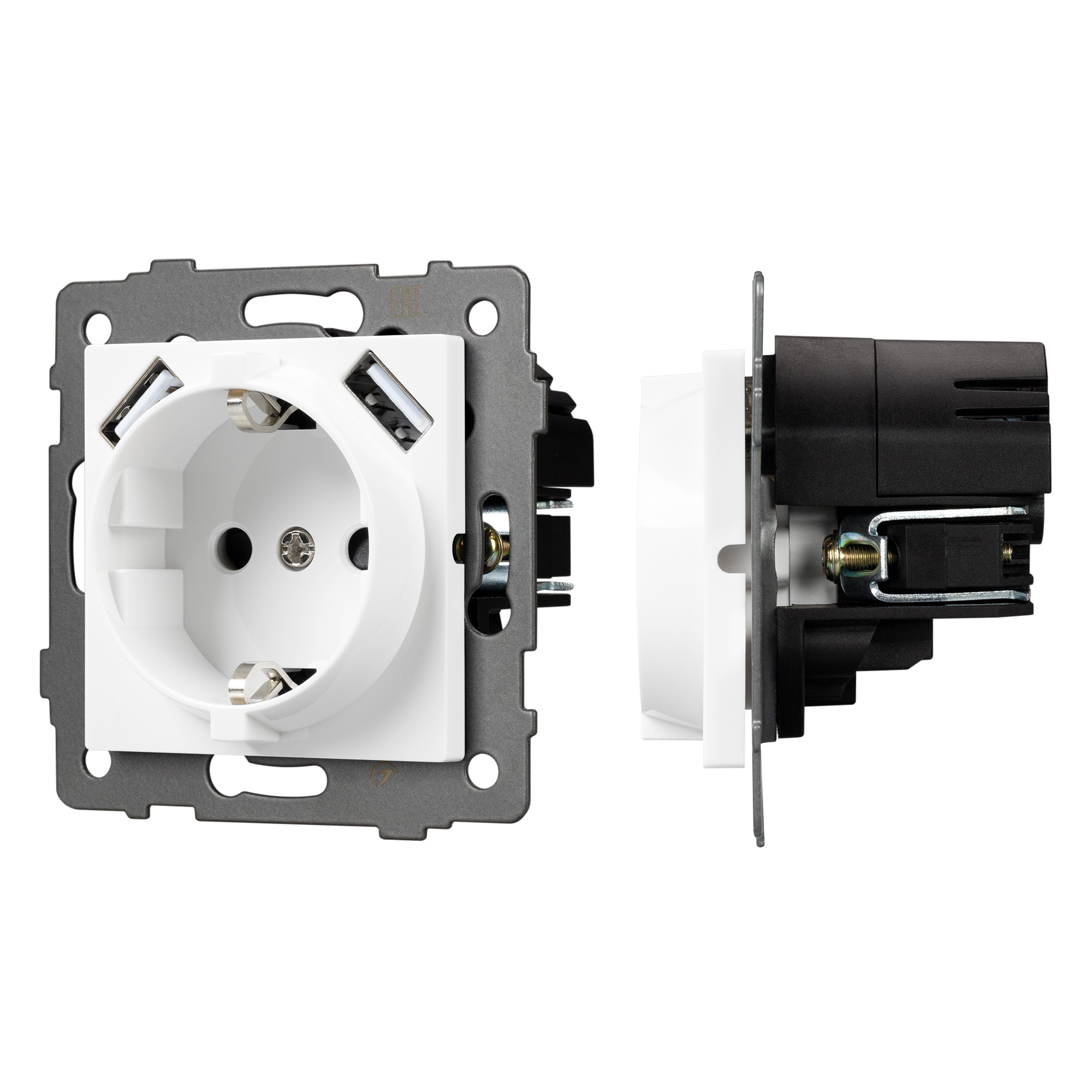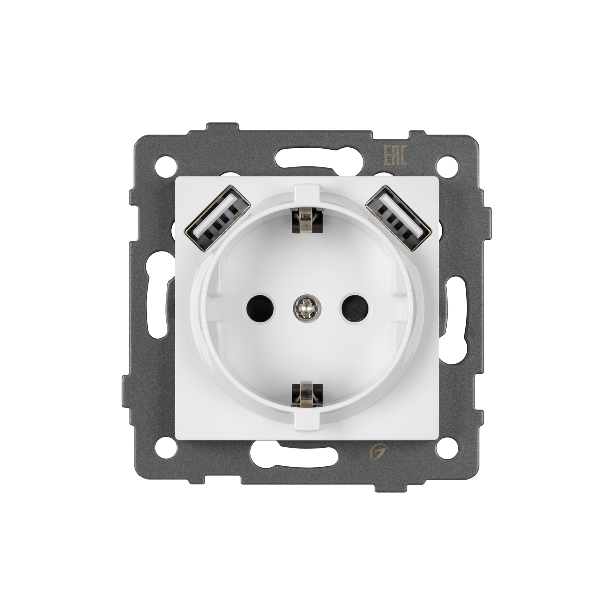 Механизм розетки с заземлением на 1 пост и 2USB Type A порта. Цвет - белый. Без фронтальной рамки. Уровень пылевлагозащиты IP20. Устанавливается в стандартный подрозетник.