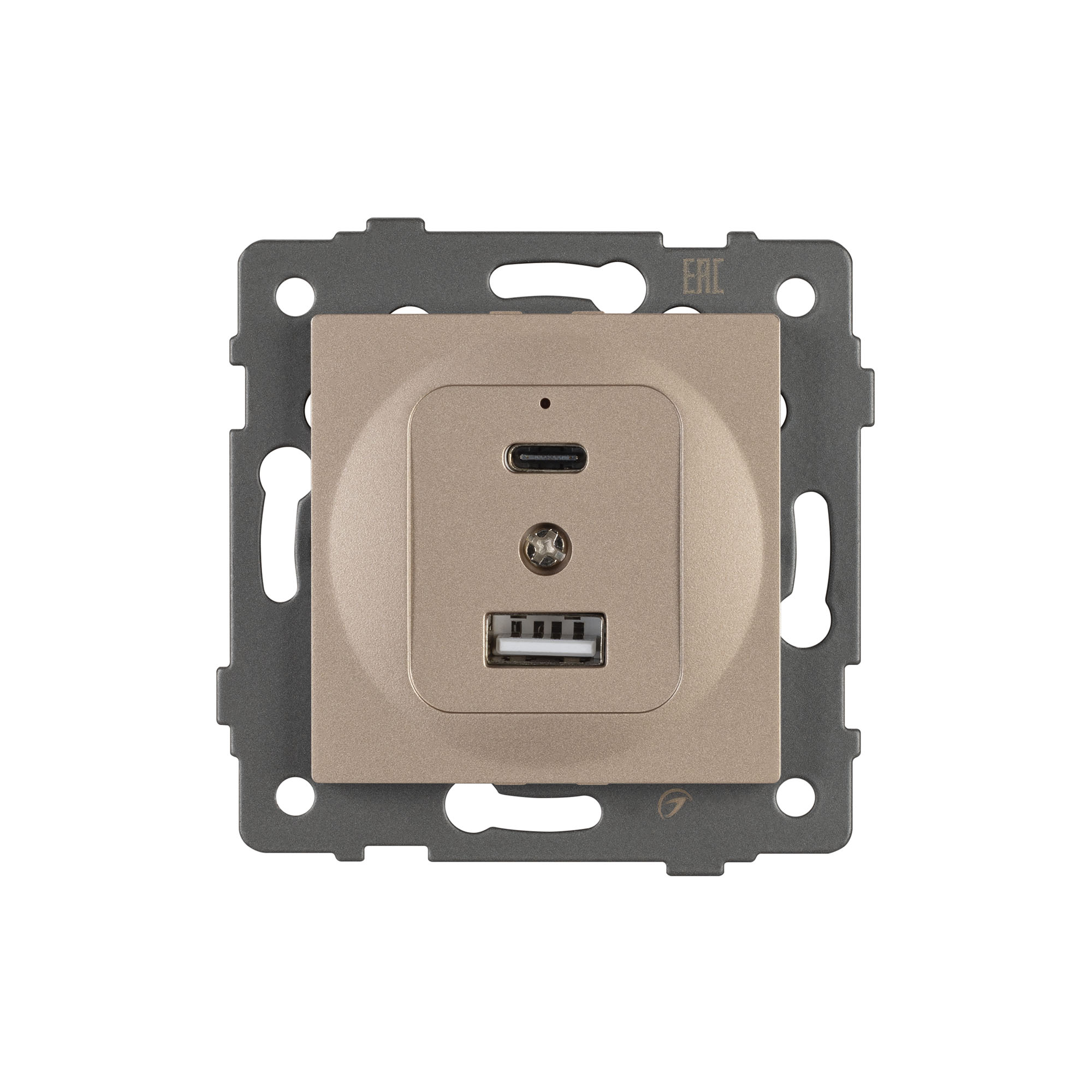 Механизм розетки с заземлением на 2 USB type A+C порта. Цвет - золотой. Без фронтальной рамки. Уровень пылевлагозащиты IP20. Устанавливается в стандартный подрозетник.
