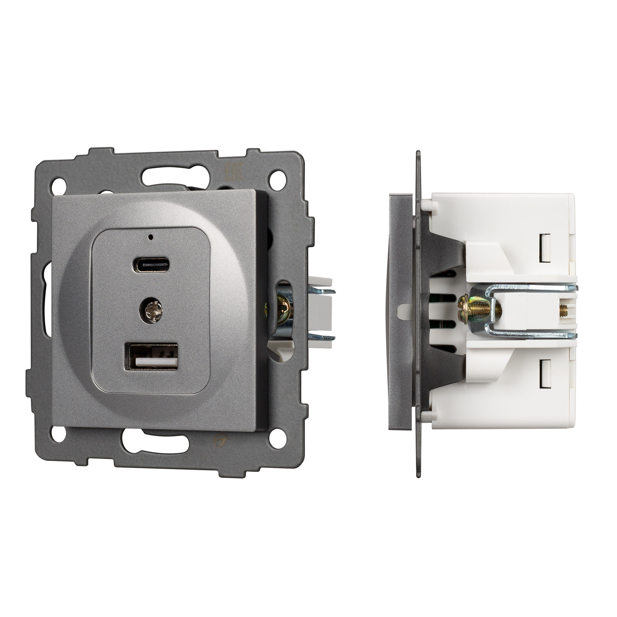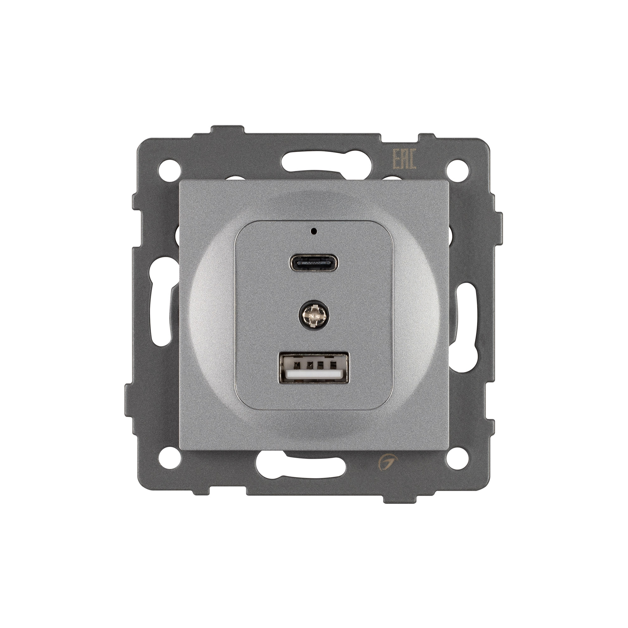 Механизм розетки с заземлением на 2 USB type A+C порта. Цвет - серый. Без фронтальной рамки. Уровень пылевлагозащиты IP20. Устанавливается в стандартный подрозетник.