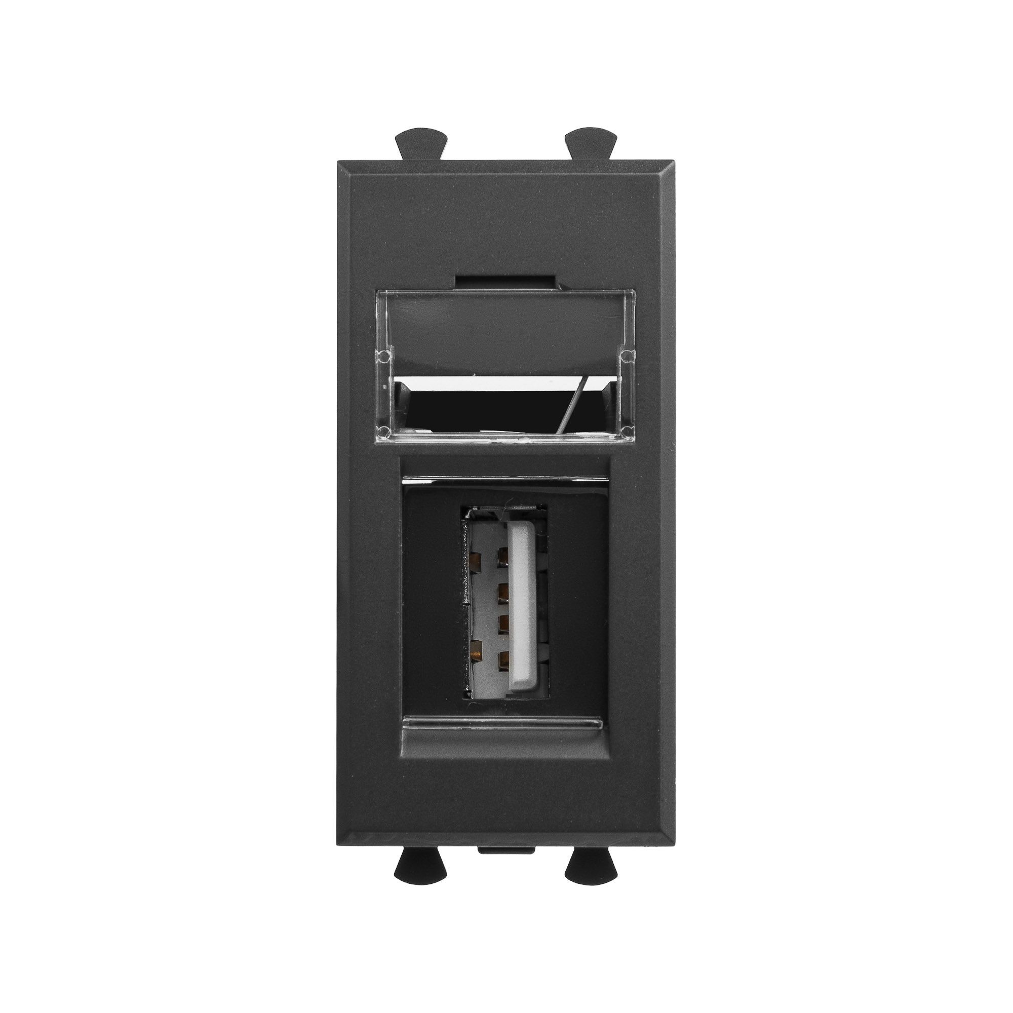 USB 2.0 зарядное устройство модульное. Назначение: для монтажа в системы "In-liner Front" и "In-liner Aero" при помощи рамок-суппортов и каркасов "Avanti" (код 4400912 и т.д.). Используется для подзарядки электронных гаджетов. Характеристики: винтовые зажимы; номинальное напряжение – 220 В; частота – 50–60 Гц; напряжение на выходе – 5 В. Фиксация производится в подрозеточные коробки глубиной не менее 45 мм при помощи каркаса с лапками (код 4400802) и саморезов. 1 модуль. Цвет: "Черный матовый".