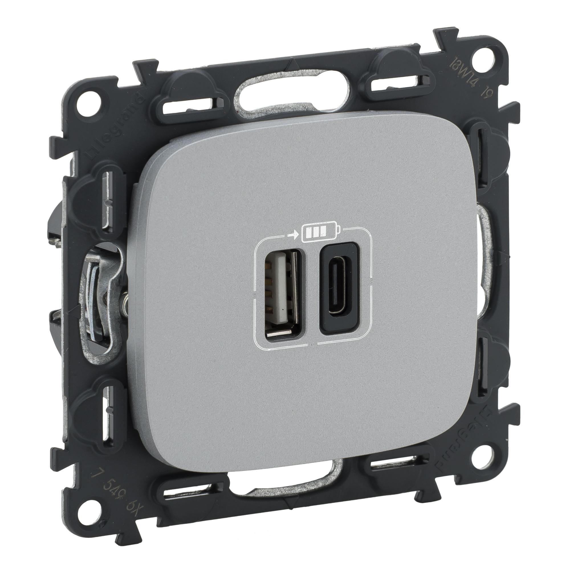 Legrand Valena Allure, алюминий, зарядное устройство с двумя USB разъемами A-C от производителя Legrand. Артикул производителя 754967.