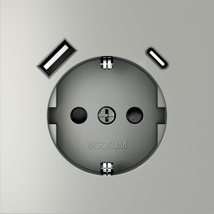 Розетка встраиваемая VOLTUM S70 с заземлением и защитными шторками, 16А, с USB, A+С, (сталь). Место установки. USB-розетки становятся все более распространенным не только в офисах, но и дома, так как значительно упрощают зарядку гаджетов. Их установка экономит место (массивные блоки питания больше не понадобятся), они органично смотрятся в технологичном интерьере.
