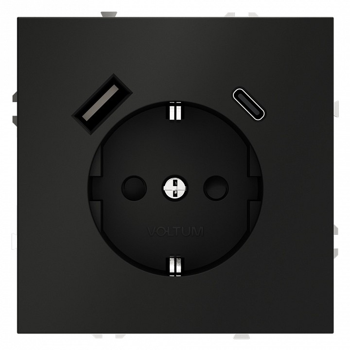 Розетка встраиваемая VOLTUM S70 с заземлением и защитными шторками, 16А, с USB, A+С, (черный матовый. Место установки. USB-розетки становятся все более распространенным не только в офисах, но и дома, так как значительно упрощают зарядку гаджетов. Их установка экономит место (массивные блоки питания больше не понадобятся), они органично смотрятся в технологичном интерьере.