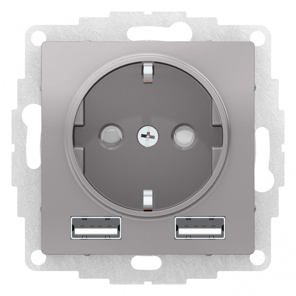 Розетка силовая Systeme Electric (ранее Schneider Electric) серии AtlasDesign 16А (цвет алюминий) с заземлением и шторками с розеткой USB, с друмя разъемами типа А