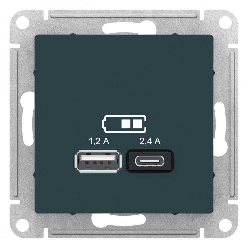 Розетка Systeme Electric (ранее Schneider Electric) серии AtlasDesign в цвете изумруд двойная USB с разъемами типа A+C - Лицевые детали из качественного ABS-пластика, устойчивого к царапинам и УФ-излучению. - Самая современная USB-зарядка с двумя разъемами позволяет заряжать как стандартные мобильные устройства через разъем типа А, так и новейшие устройства, в том числе ноутбуки, с разъемом типа С.