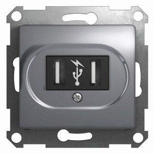 Механизм Schneider Electric Glossa (цвет алюминий) розетки для зарядки с двумя разъёмами USB с выходными напряжением 5 В постоянного тока и выходами с номинальным током по 1,4 А.