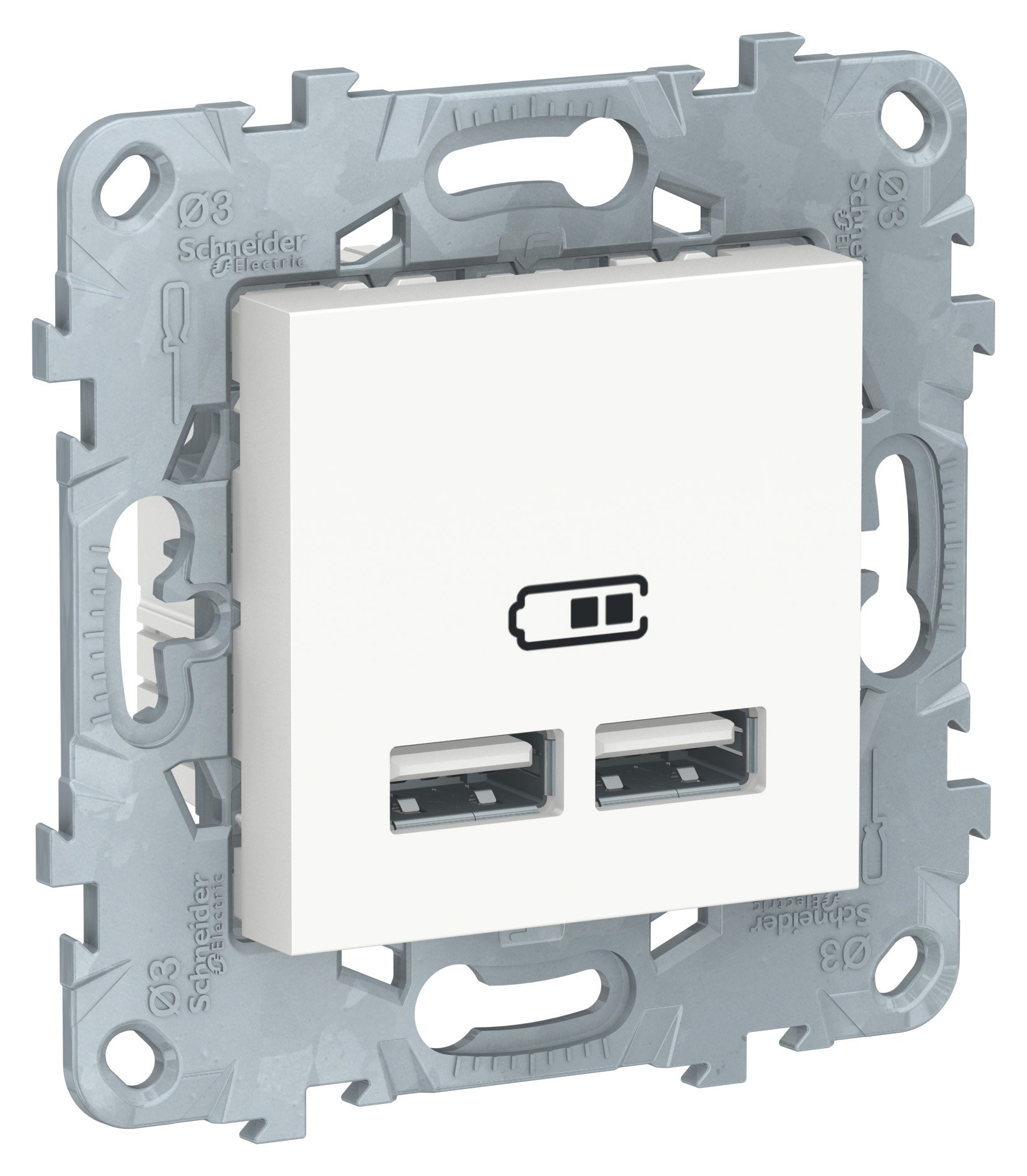 Розетка USB зарядная Schneider Electric UNICA NEW (белый) с двумя разъёмами предназначена для сетей до 5 В постоянного тока и максимальный ток нагрузки 2,1 А.
