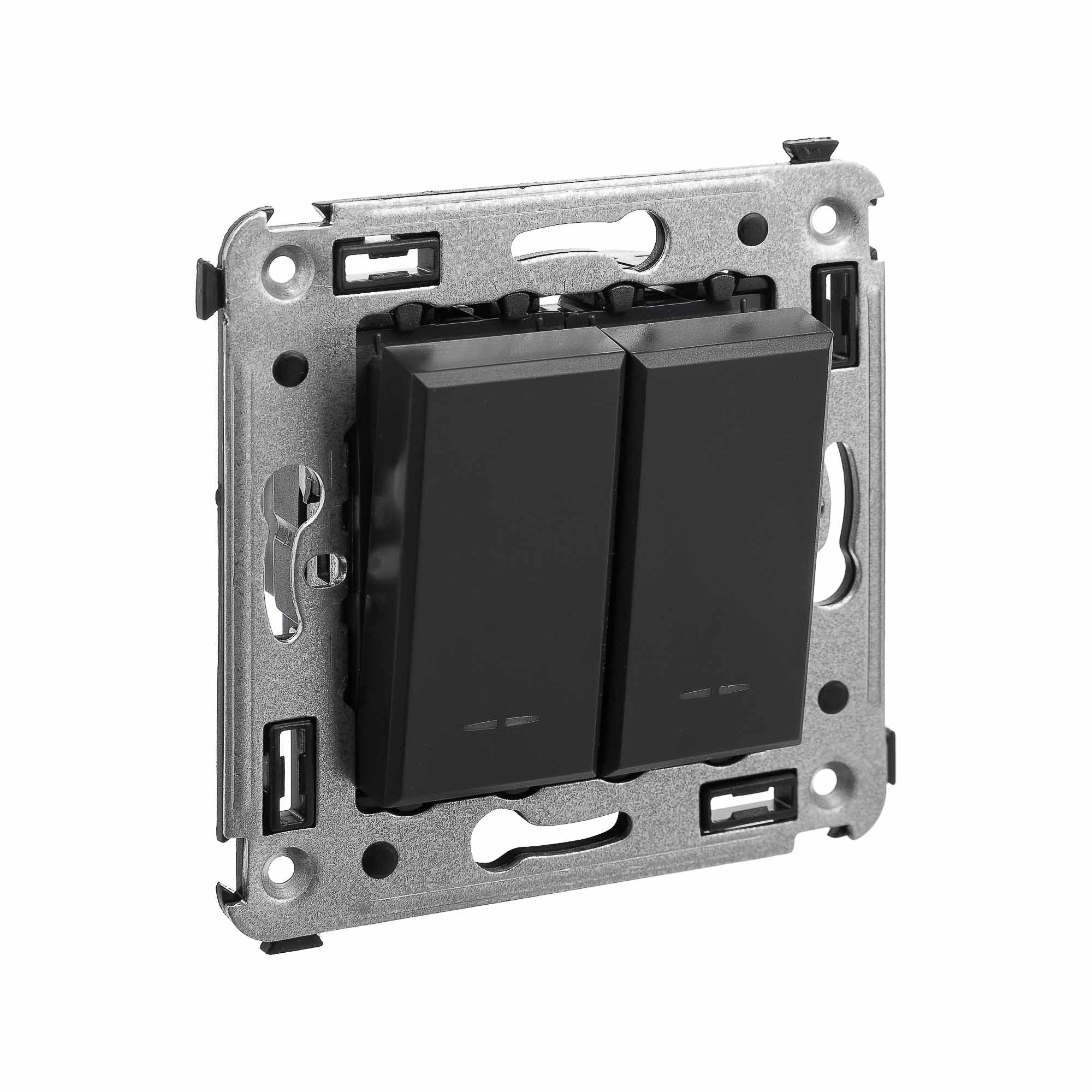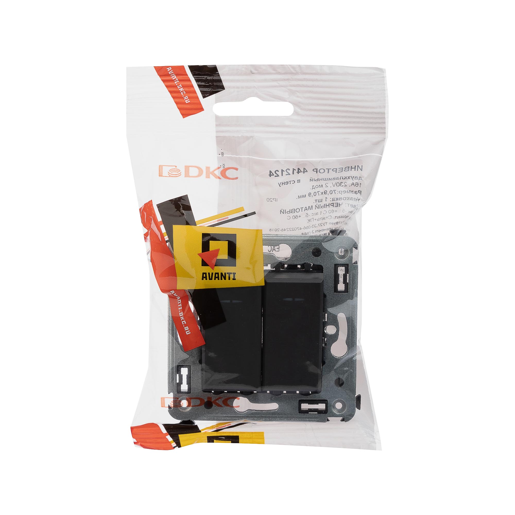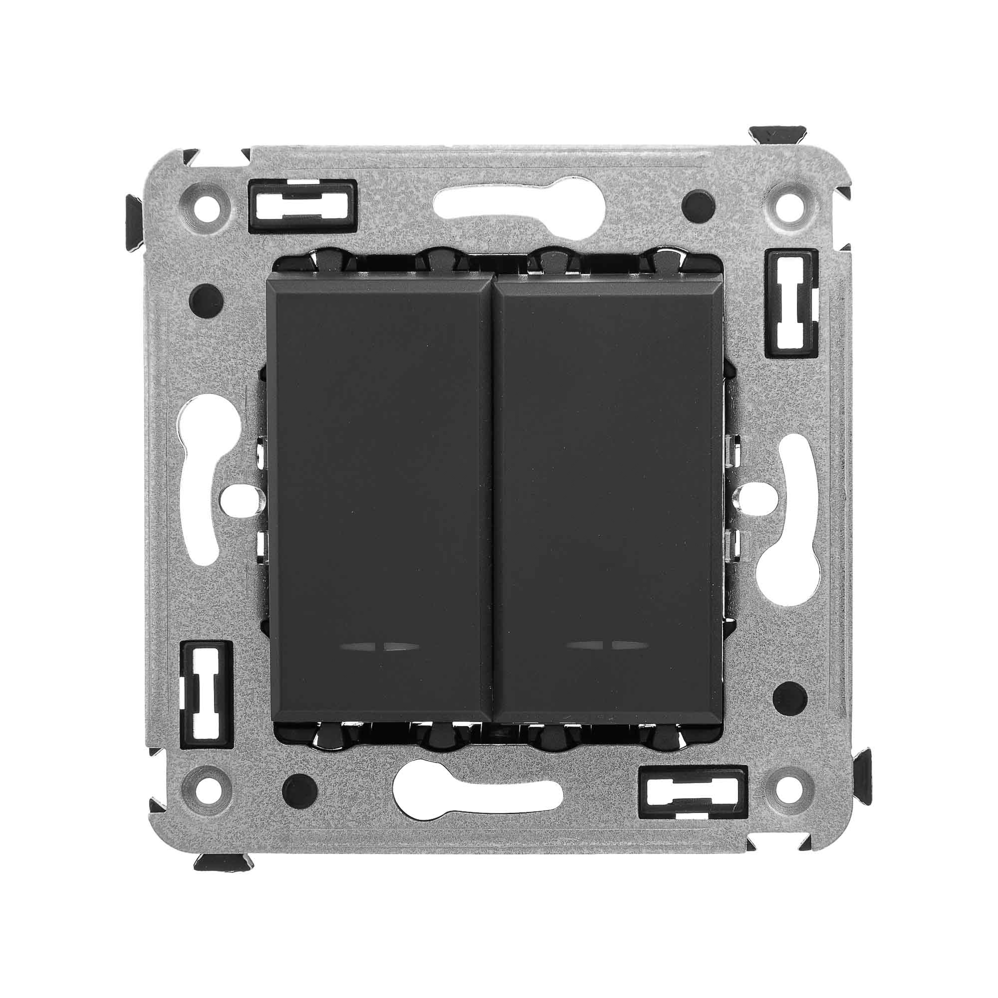 Инвертор двухклавишный. Назначение: для монтажа в подрозеточные коробки глубиной не менее 45 мм (код 59301). Используется для включения/выключения освещения из трех и более мест. Характеристики: 2 модуля, диаметр отверстий для ввода кабелей – 3 мм (по 2 отверстия на одну клемму); винтовые зажимы; шаблон для зачистки кабеля – 11 мм; номинальный ток – 16 A; номинальное напряжение – 230 В. Фиксация производится в подрозеточную коробку при помощи саморезов. Цвет: "Черный матовый".
