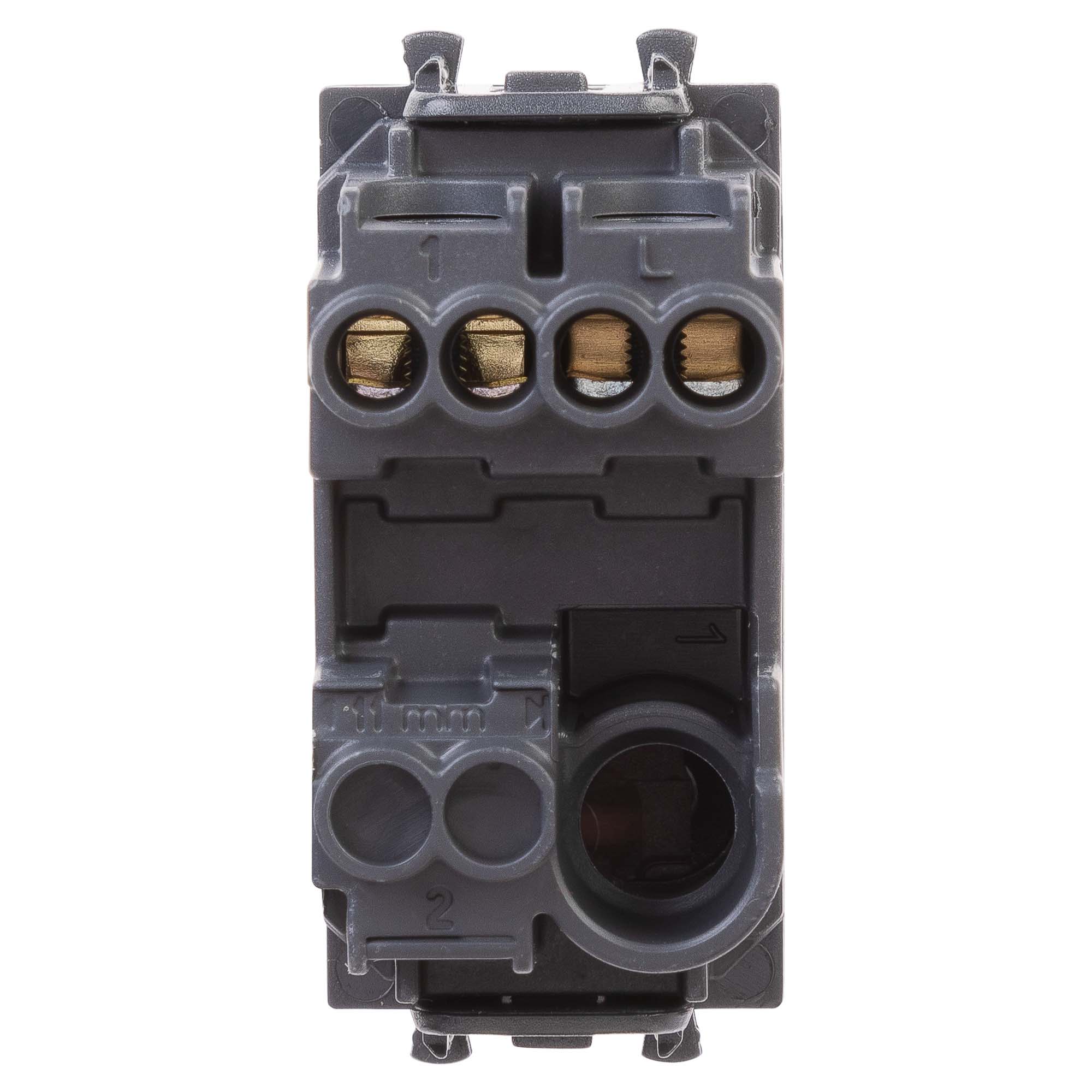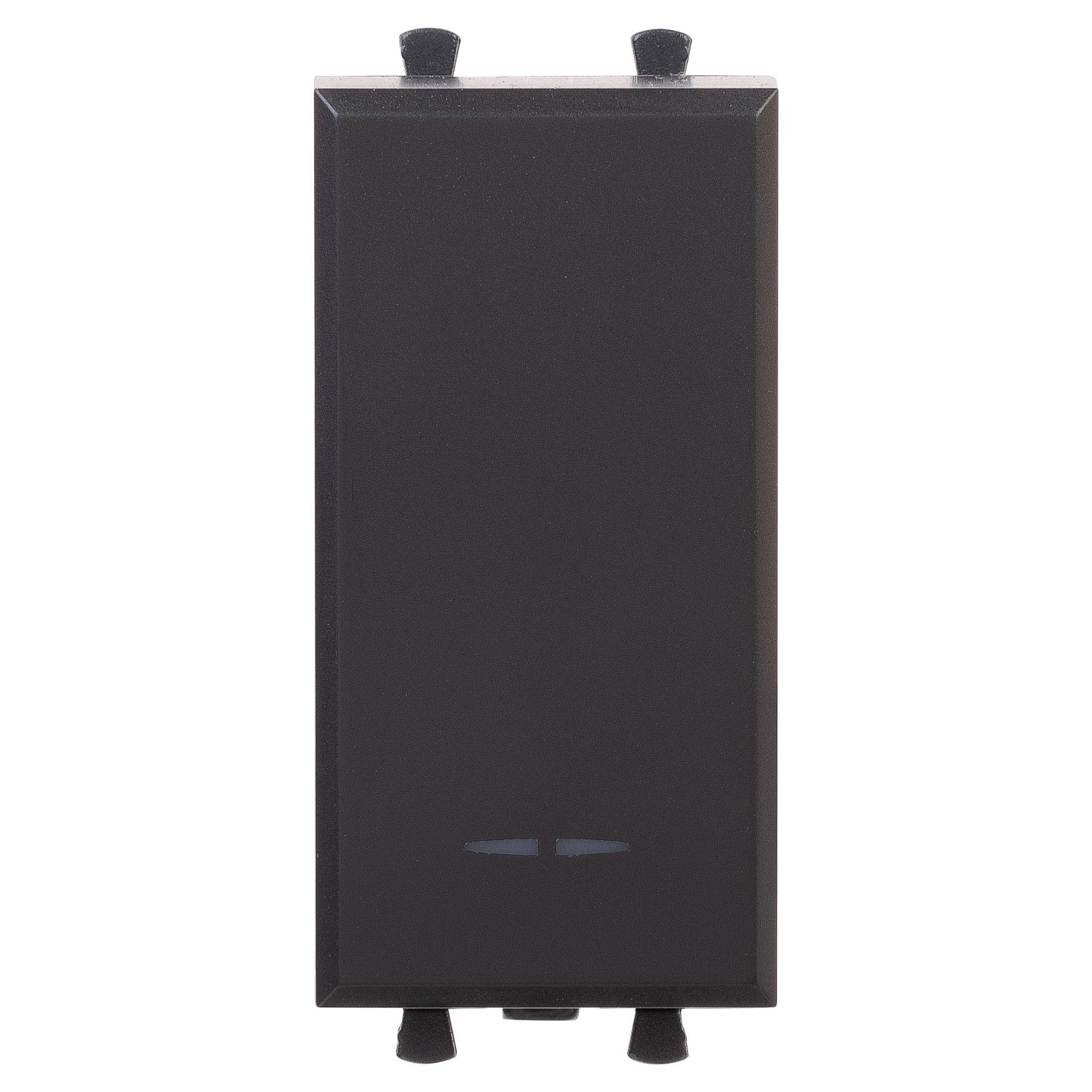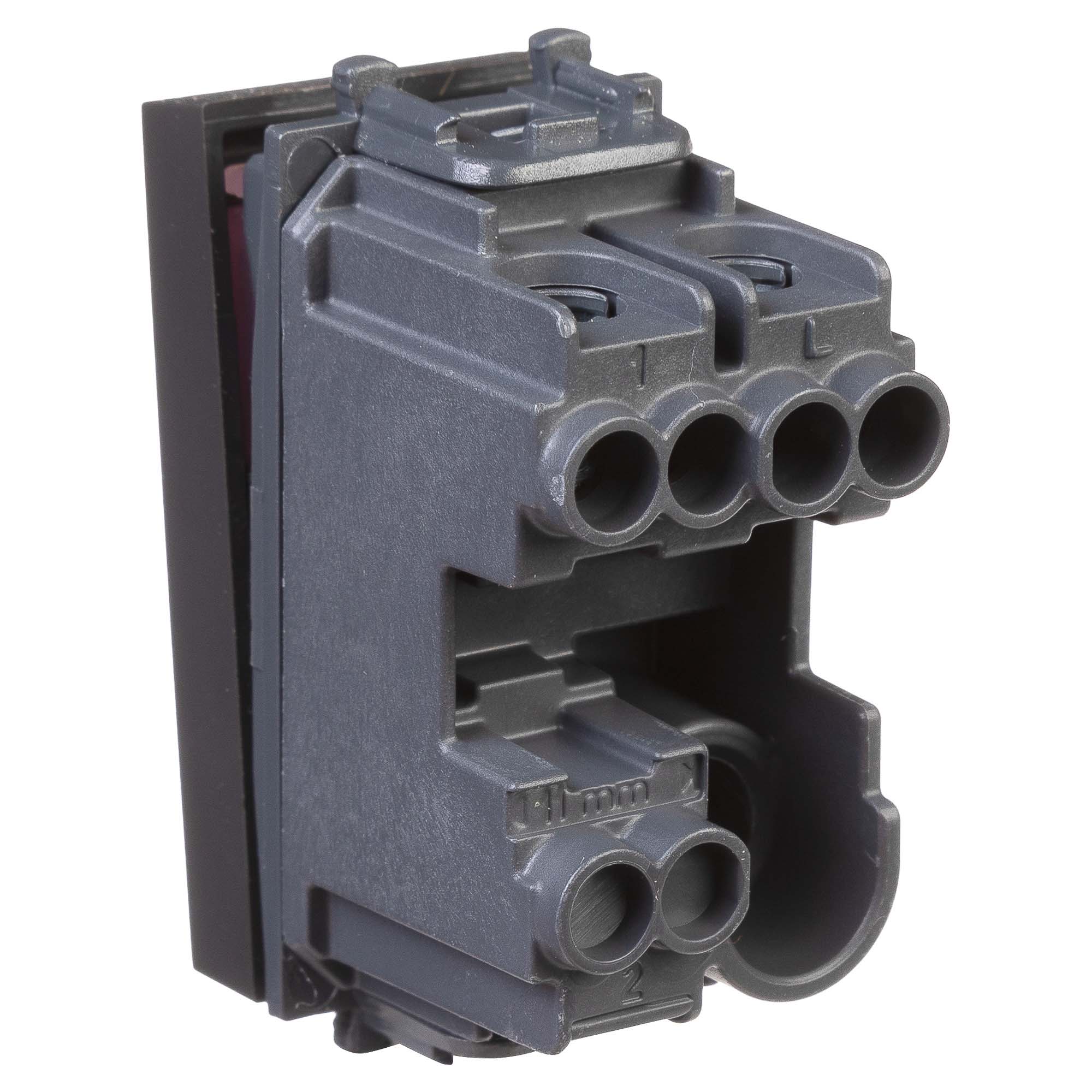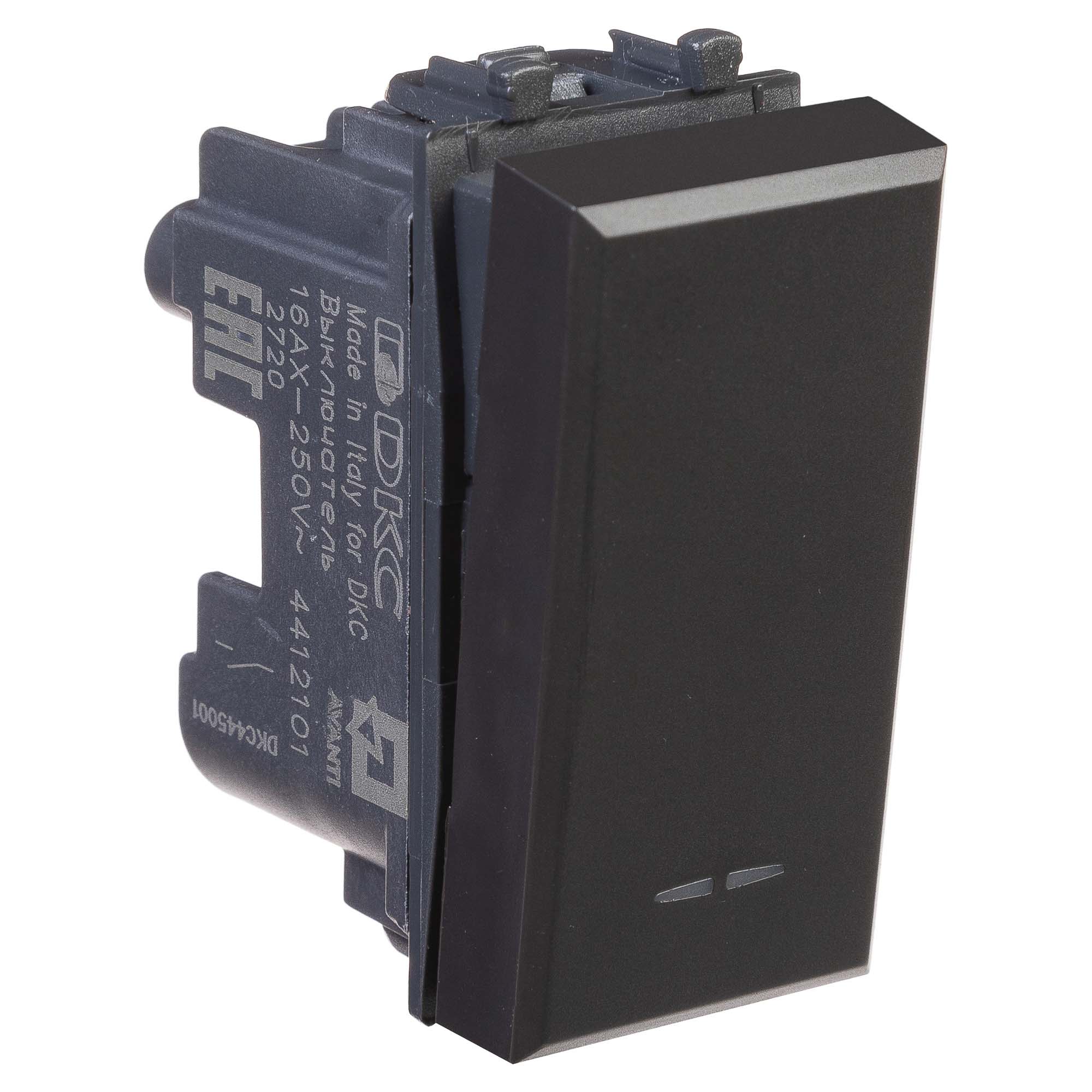 Выключатель одноклавишный однополюсный, модульный. Предназначен для монтажа в системы "In-liner Front" и "In-liner Aero" при помощи рамок-суппортов и каркасов "Avanti" (код 4400912 и т.д.). Используется для включения/выключения освещения. Характеристики: диаметр отверстий для ввода кабелей – 3 мм (по 2 отверстия на одну клемму); винтовые зажимы; шаблон для зачистки кабеля – 11 мм; номинальный ток – 16 A; номинальное напряжение – 230 В. Возможна фиксация в подрозеточные коробки при помощи каркаса с лапками (код 4400802) и саморезов. 1 модуль. Цвет: "Черный матовый".
