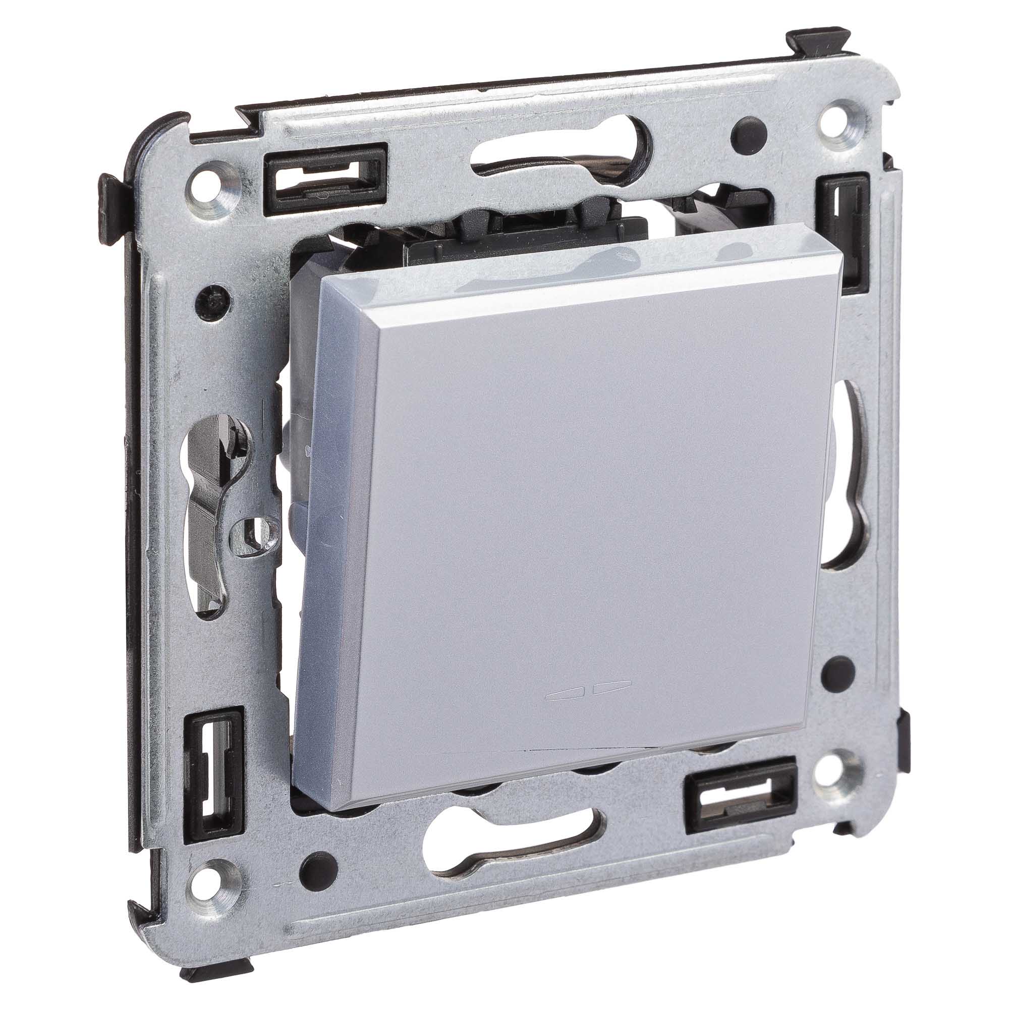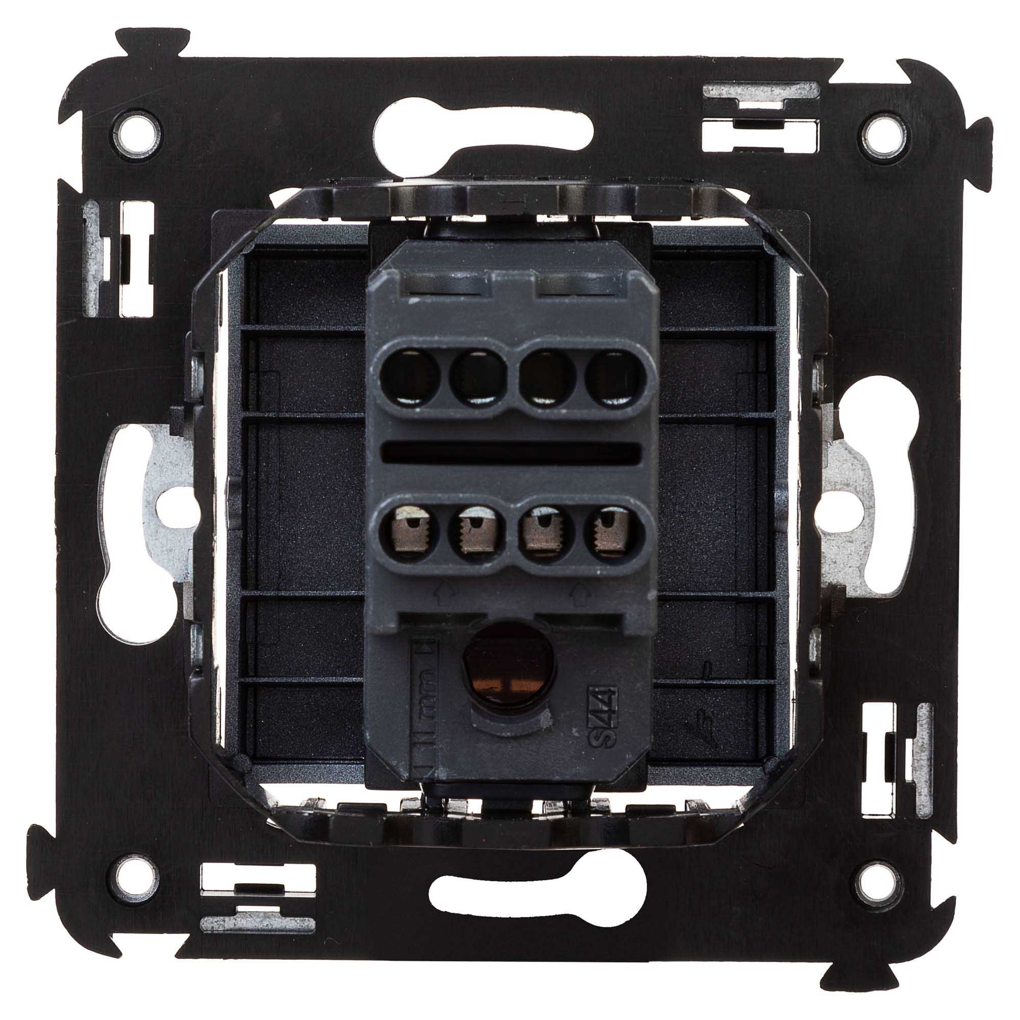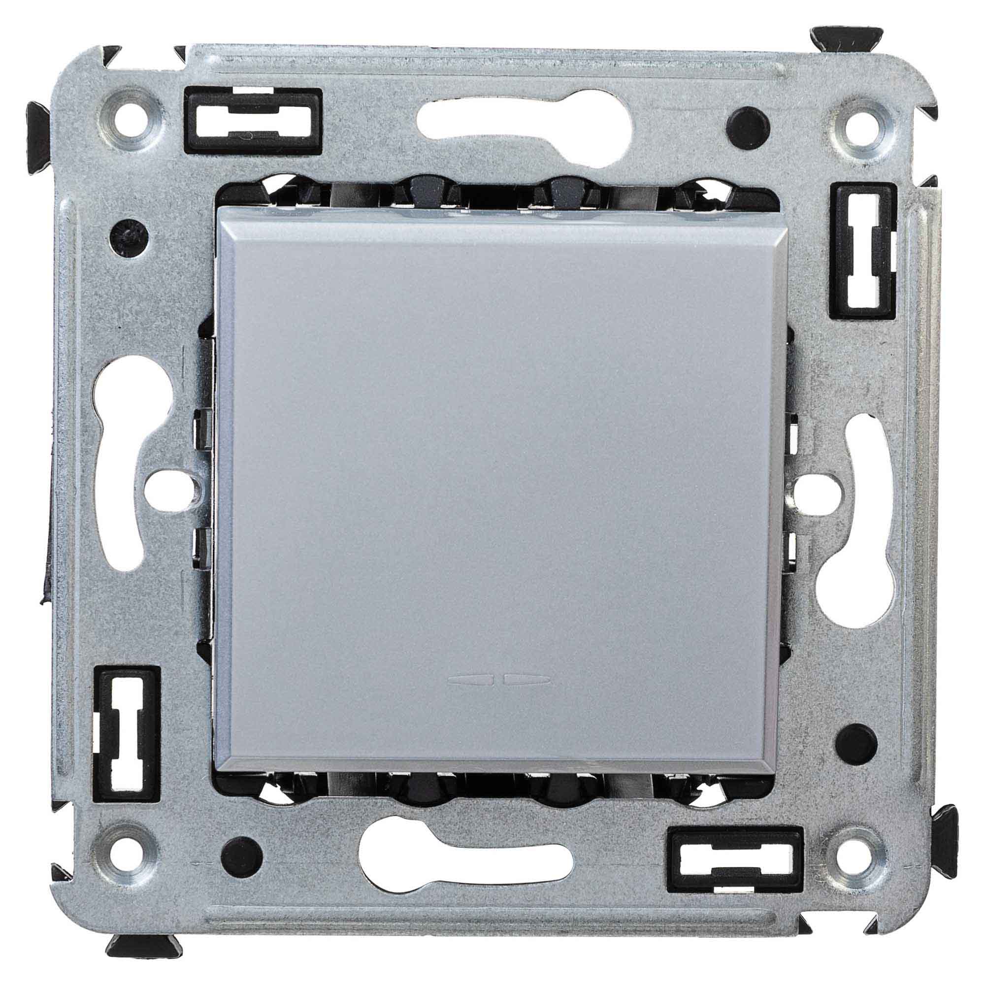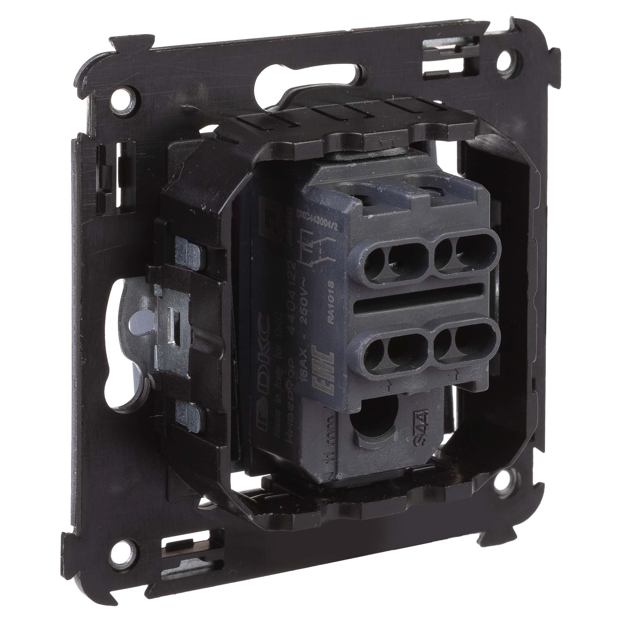 Инвертор одноклавишный модульный. Назначение: для монтажа в подрозеточные коробки (код 59301); включение/выключение освещения с трех и более мест. Характеристики: диаметр отверстий для ввода кабелей – 3 мм (по 2 отверстия на одну клемму); винтовые зажимы; шаблон для зачистки кабеля – 11 мм; номинальный ток – 16 A; номинальное напряжение – 230 В; фиксация в подрозеточные коробки при помощи каркаса с лапками (код 4400802) и саморезов. Кол-во модулей: 2. Цвет: "Закаленная сталь"