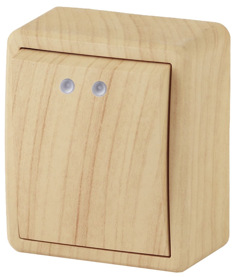 Выключатель 1-клавишный с подсветкой серии Эра Эксперт открытой установки цвет сосна 11-1202-11. Номинальные характеристики 10А 250В . Выключатель выполнен из качественного поликарбоната, оснащён уникальными винтовыми клеммами ЭКСПЕРТ для максимально качественного зажима кабеля в механизме.