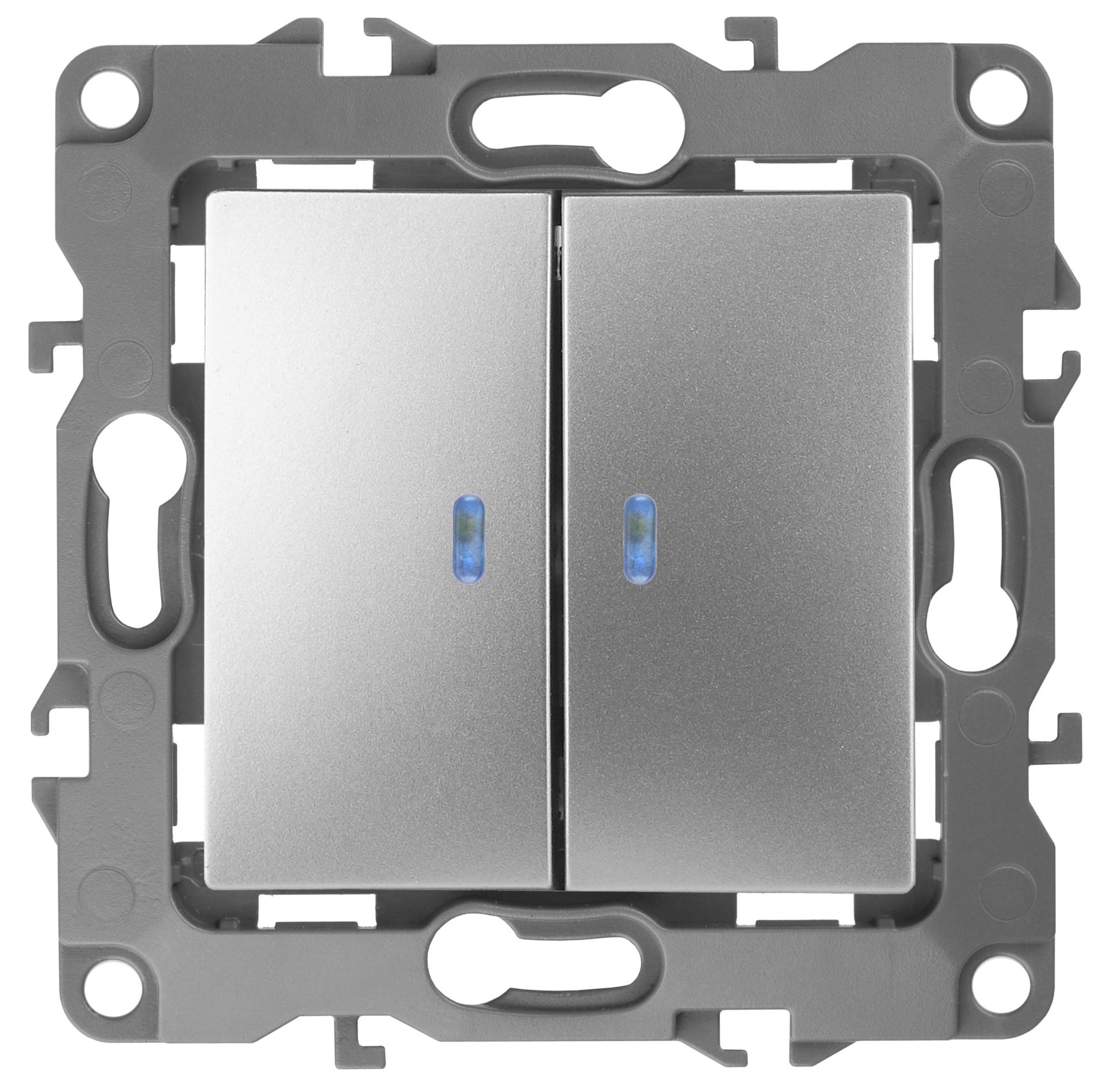 Выключатель 2-клавишный с подсветкой серии Эра 12 скрыт.установки механизм цвет алюминий 12-1105-03. Номинальные характеристики 10А 250В . Сделан из поликарбоната, оснащёно автоматическими клеммами для быстрй и надёжной фиксации жил кабеля в механиме. Парные клеммы обеспечивают соединение шлейфом. Монтаж в подрозетник производится и на лапки, и на винты. Рамки приобретаются отдельно. Рамки Эра 12: 1 пост 12-5001-хх, 2 поста 12-5002-хх, 3 поста 12-5003-хх, 4 поста 12-5004-хх, 5 постов 12-5005-хх. Рамки Эра 12 Сатин: 1 пост 12-5101-хх, 2 поста 12-5102-хх, 3 поста 12-5103-хх, 4 поста 12-5104-хх, 5 постов - 12-5105-хх (хх - код цвета: 01-белый, 02-слоновая кость, 03-алюминий, 04-шампань, 05-антрацит, 06-чёрный, 07-ольха(белёный дуб-сатин), 08-вишня, 09-дуб, 10-венге, 11-сосна, 21-жёлтый, 22-оранжевый, 23-красный, 24-охра, 25-бордо, 26-лайм, 27-зелёный, 28-голубой, 29-синий).
