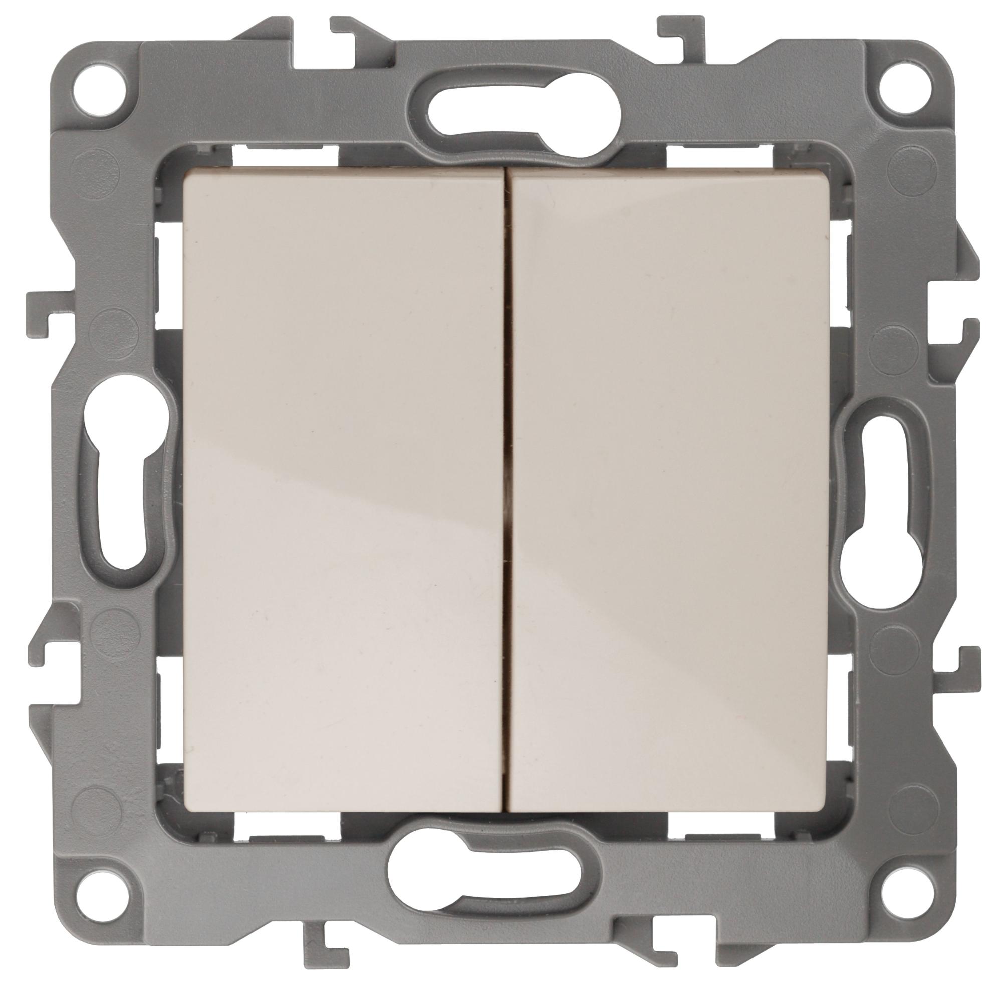 Выключатель 2-клавишный проходной серии Эра 12 скрытой установки механизм цвет слоновая кость 12-1106-02. Номинальные характеристики 10А 250В . Сделан из поликарбоната, оснащёно автоматическими клеммами для быстрй и надёжной фиксации жил кабеля в механиме. Парные клеммы обеспечивают соединение шлейфом. Монтаж в подрозетник производится и на лапки, и на винты. Рамки приобретаются отдельно. Рамки Эра 12: 1 пост 12-5001-хх, 2 поста 12-5002-хх, 3 поста 12-5003-хх, 4 поста 12-5004-хх, 5 постов 12-5005-хх. Рамки Эра 12 Сатин: 1 пост 12-5101-хх, 2 поста 12-5102-хх, 3 поста 12-5103-хх, 4 поста 12-5104-хх, 5 постов - 12-5105-хх (хх - код цвета: 01-белый, 02-слоновая кость, 03-алюминий, 04-шампань, 05-антрацит, 06-чёрный, 07-ольха(белёный дуб-сатин), 08-вишня, 09-дуб, 10-венге, 11-сосна, 21-жёлтый, 22-оранжевый, 23-красный, 24-охра, 25-бордо, 26-лайм, 27-зелёный, 28-голубой, 29-синий).
