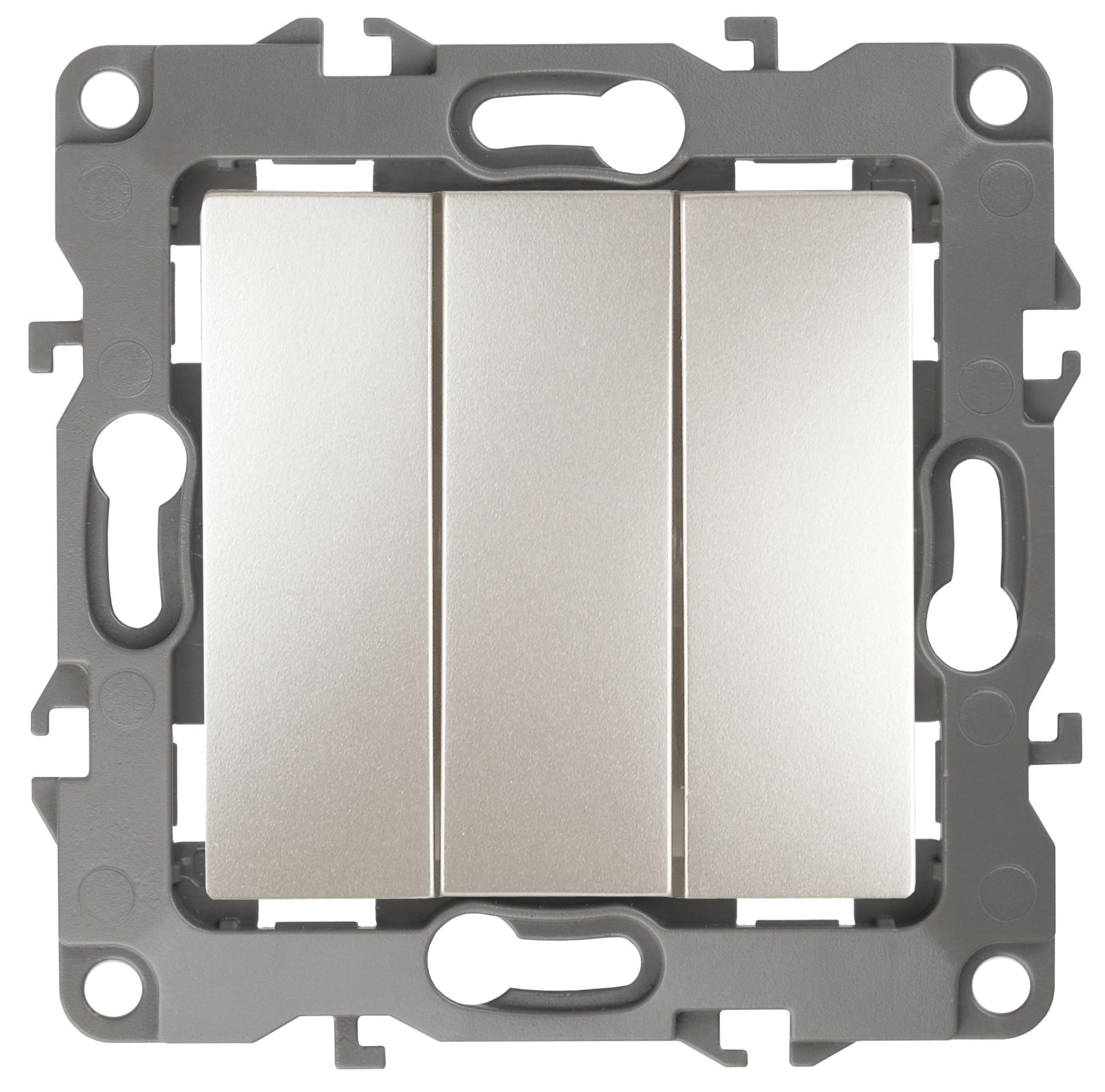 Выключатель 3-клавишный серии Эра 12 скрытой установки механизм цвет перламутр 12-1107-15. Номинальные характеристики 10А 250В . Сделан из поликарбоната, оснащён винтовыми уникальными клеммами ЭКСПЕРТ для надёжной фиксации жил кабеля в механиме. Парные клеммы обеспечивают соединение шлейфом. Монтаж в подрозетник производится и на лапки, и на винты. Рамки приобретаются отдельно.