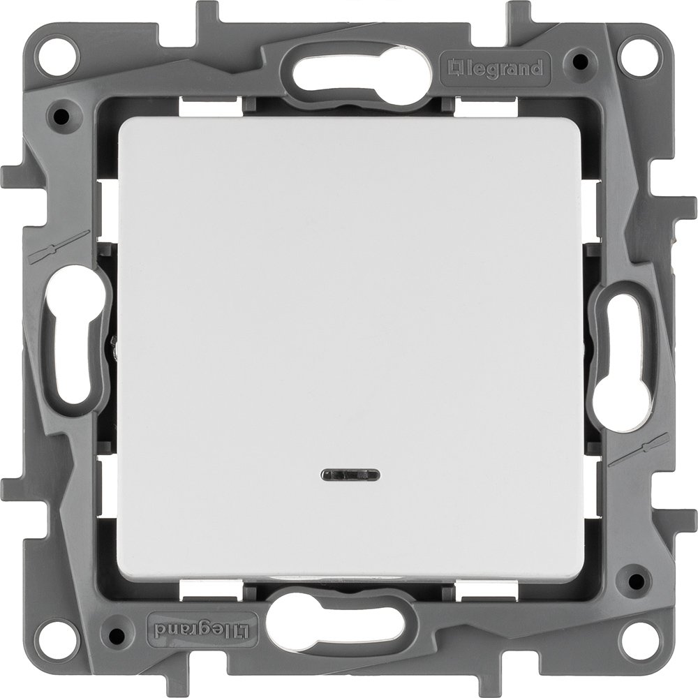 Выключатель с подсветкой одноклавишный Legrand Etika для скрытого монтажа, номинальный ток 10 А, цвет белый. Используется для управления приборами освещения, вентиляции и т.д.