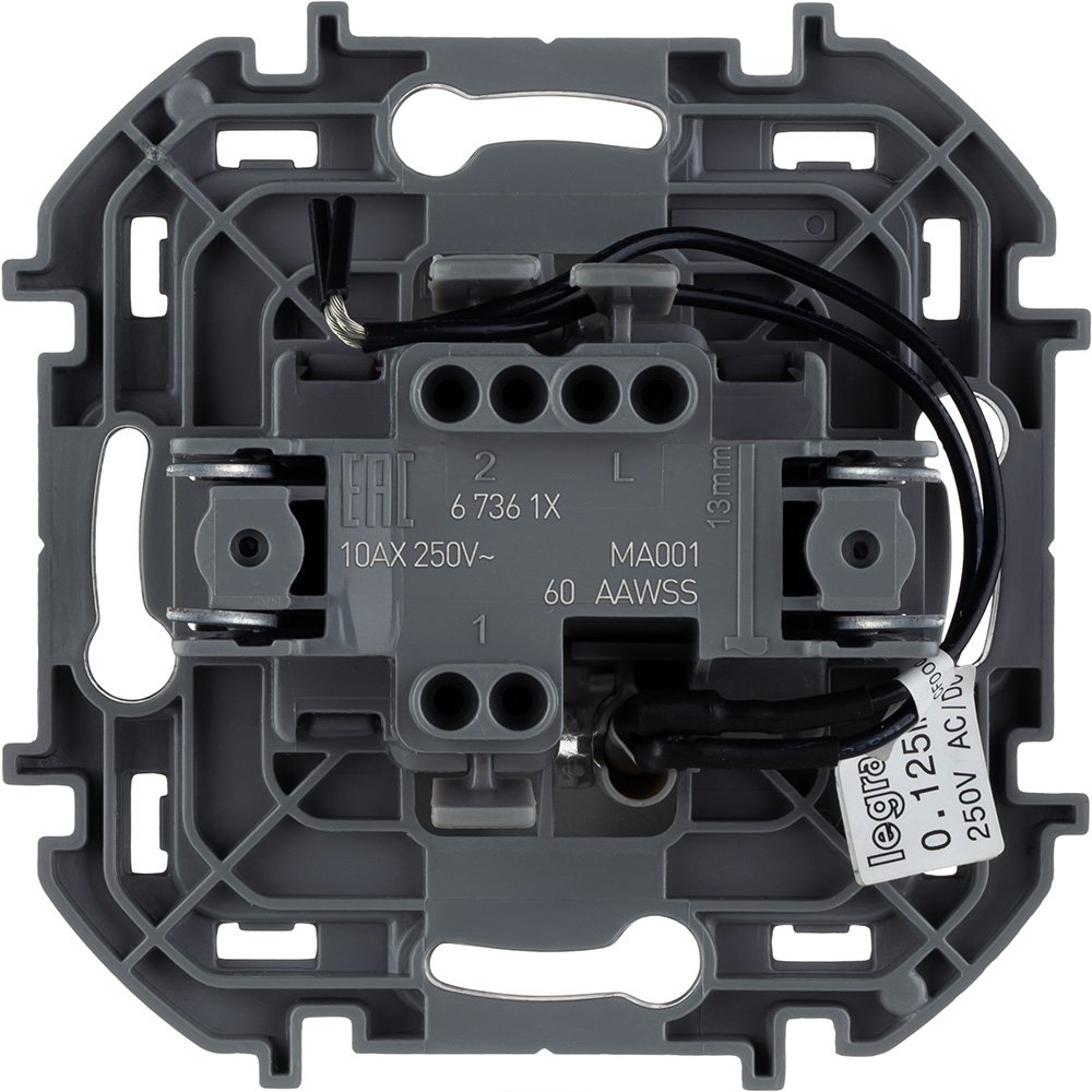 Выключатель одноклавишный с подсветкой/индикацией Legrand Inspiria для скрытого монтажа, цвет "Алюминий", номинальный ток 10 А, напряжение ~250 В. Предназначен для установки в электрических сетях жилых и общественных зданий и используется для управления приборами освещения, вентиляции и т.д. Оснащен светодиодной лампой для подсветки или индикации. Особенности изделия: - Компактный механизм с глубиной всего 20 мм. комфортно размещается в различных монтажных коробках. - Материал клавиш - глянцевый пластик АБС, стоек к выгоранию и загрязнениям. - Все токоведущие части выключателя имеют защиту от случайного прикосновения. - Безвинтовые зажимы для присоединения проводов обеспечивают быстрое подключение и отключение, гарантируют надежное и долговечное соеднинение и не требуют обслуживания. - Удобные широкие толкатели облегчают работу по демонтажу провода. - Улучшенная эргономика снижает вероятность искрения при коммутации светодиодов. - Ход клавиши короткий, не громкий. - Универсальная LED-лампа белого цвета с низк