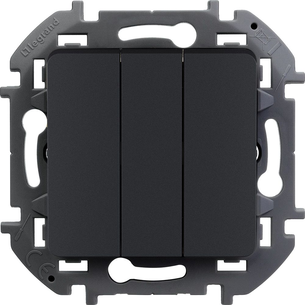 Выключатель трехклавишный Legrand Inspiria для скрытого монтажа, цвет "Антрацит", увеличенный номинальный ток 20 А, напряжение ~250В. Предназначен для установки в электрических сетях жилых и общественных зданий и используется для управления приборами освещения, вентиляции и т.д. Используется для независимой коммутации трех нагрузок с одного места, подходит для управления многорожковыми люстрами и осветительными приборами с большим количеством ламп. Особенности изделия: - Материал клавиш - глянцевый пластик АБС, стоек к выгоранию и загрязнениям. - Для подсоединения проводов используются винтовые зажимы. - Все токоведущие части выключателя имеют защиту от случайного прикосновения. - Улучшенная эргономика снижает вероятность искрения при коммутации светодиодов. - Ход клавиши короткий, не громкий.