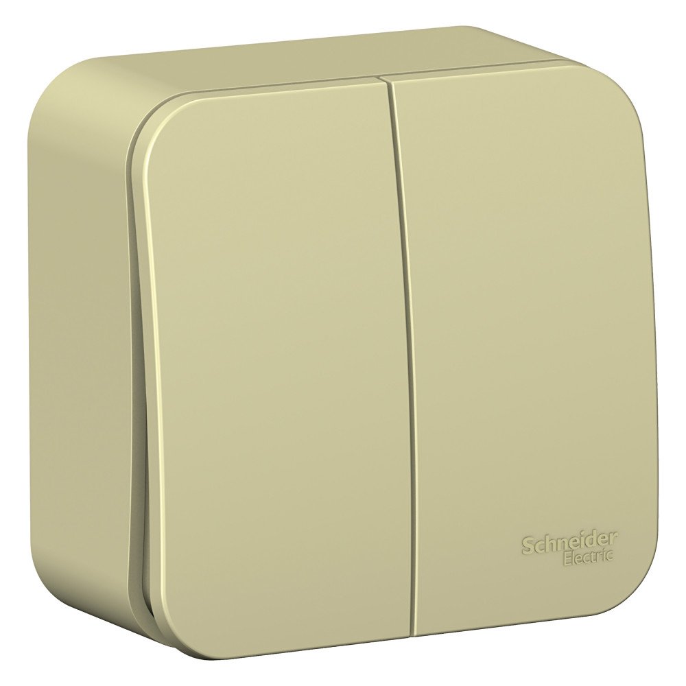 Выключатель двухклавишный Systeme Electric (ранее Schneider Electric) BLANCA (открытой установки, цвет бежевый) с изолирующей пластиковой пластиной предназначен для сетей до 250 В, на ток до 10 А.
