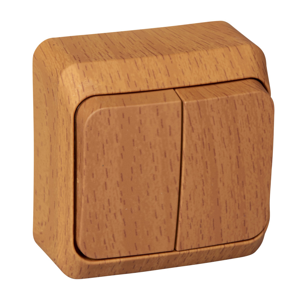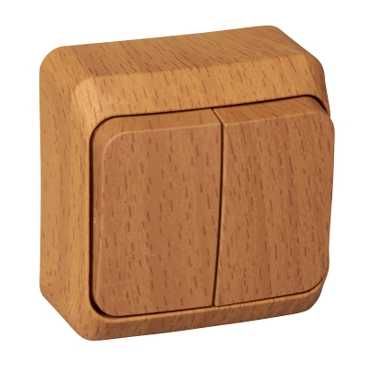 Выключатель Systeme Electric (ранее Schneider Electric) ЭТЮД (бук, открытой установки) двухклавишный предназначен для применения в сетях до 250В, на ток до 10А. Наличие подсветки делает его легко находимым при отсутствии освещения. Две клавиши позволяют управлять двумя источниками света с одной точки. Изделия цвета Бук обладают уникальным рисунком, напоминающим древесный сруб. Сделано в России.