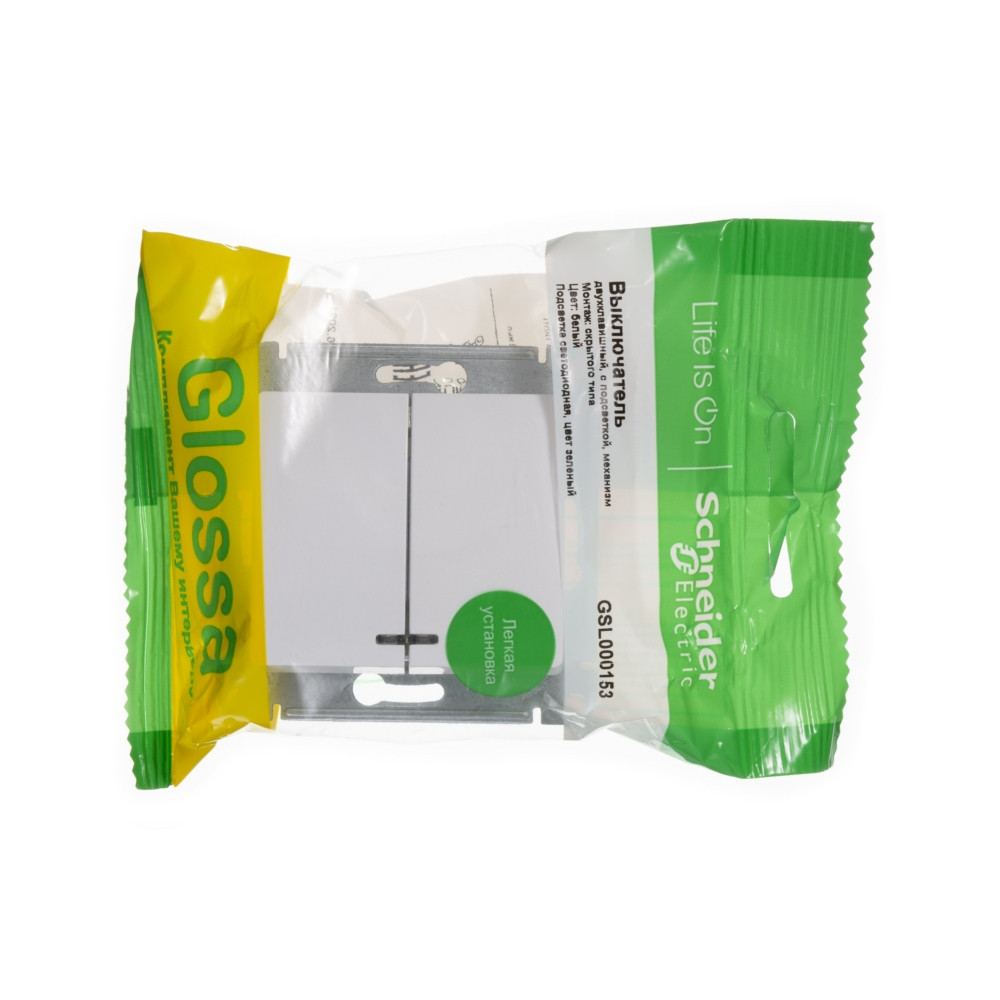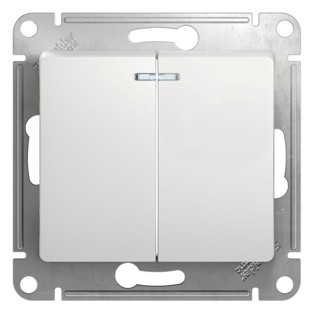 Механизм Systeme Electric (ранее Schneider Electric) серии Glossa (цвет белый) выключателя 2-клавишного c подсветкой подходит для сетей 250 В, на ток 10 А.