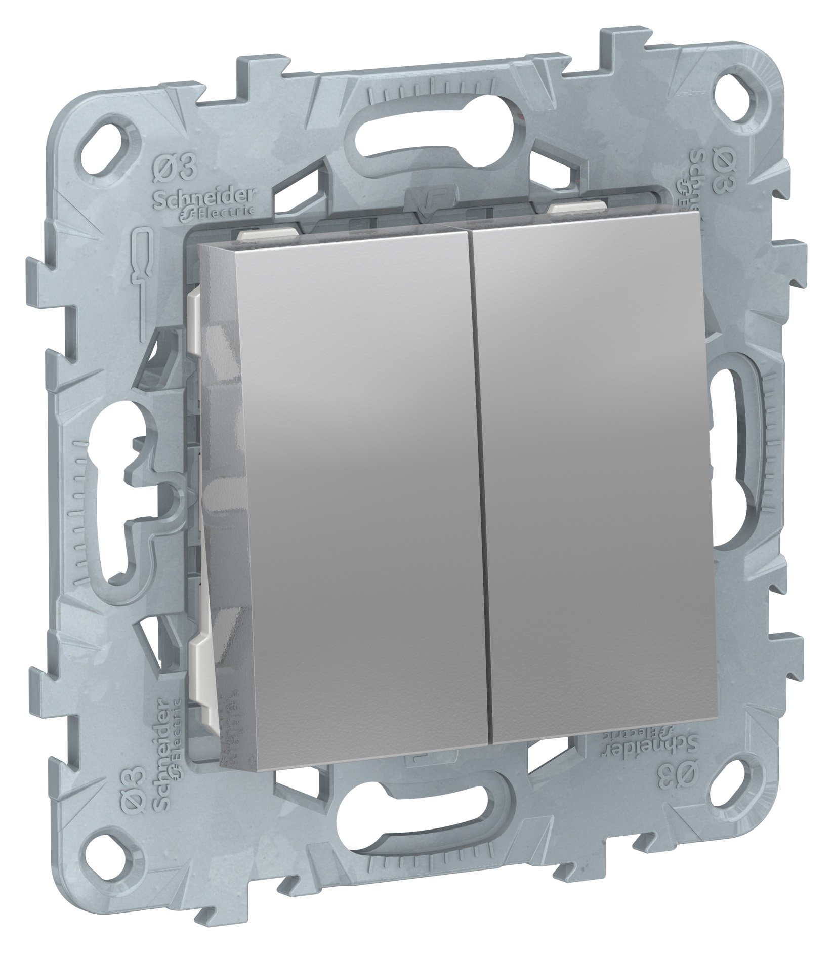 Переключатель двухклавишный Schneider Electric UNICA NEW (алюминий) без подсветки предназначен для сетей до 250 В на ток до 10 А.