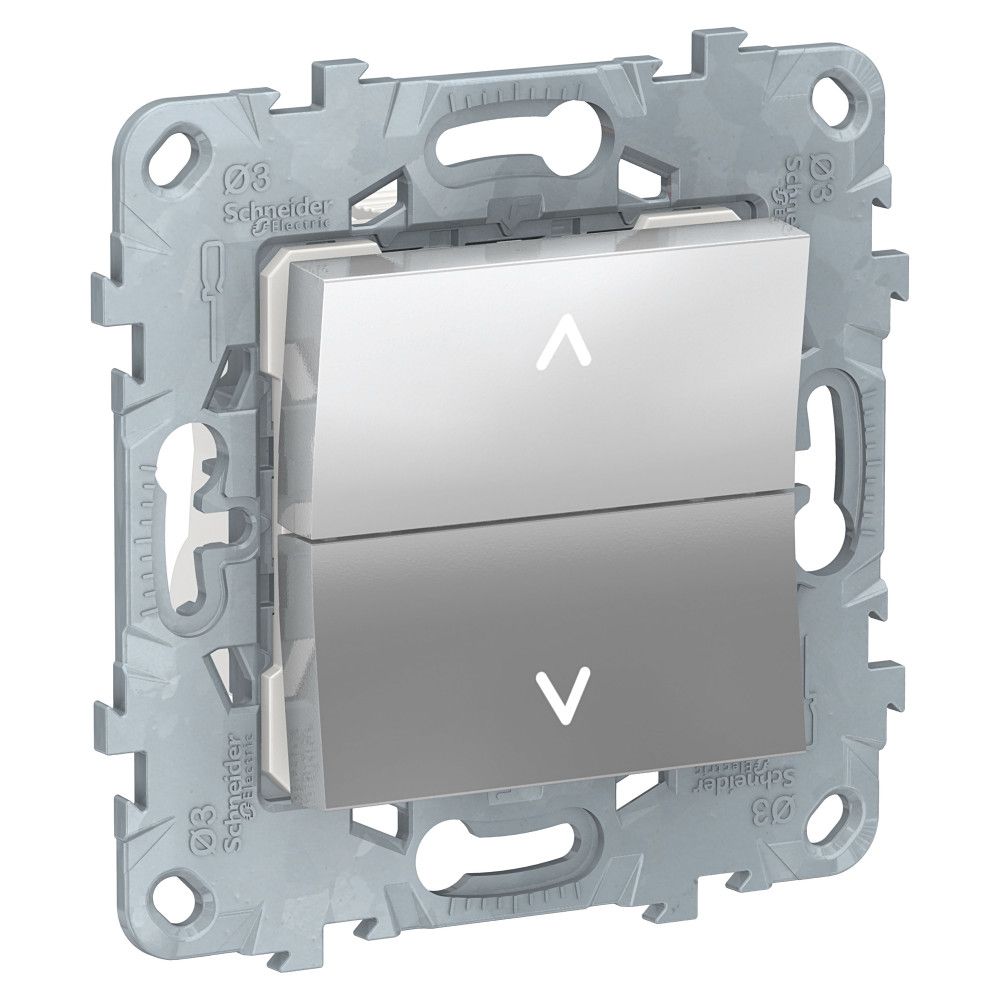 Выключатель двухклавишный для жалюзи Schneider Electric UNICA NEW (алюминий) без подсветки и без фиксации предназначен для сетей до 250 В на ток до 10 А.