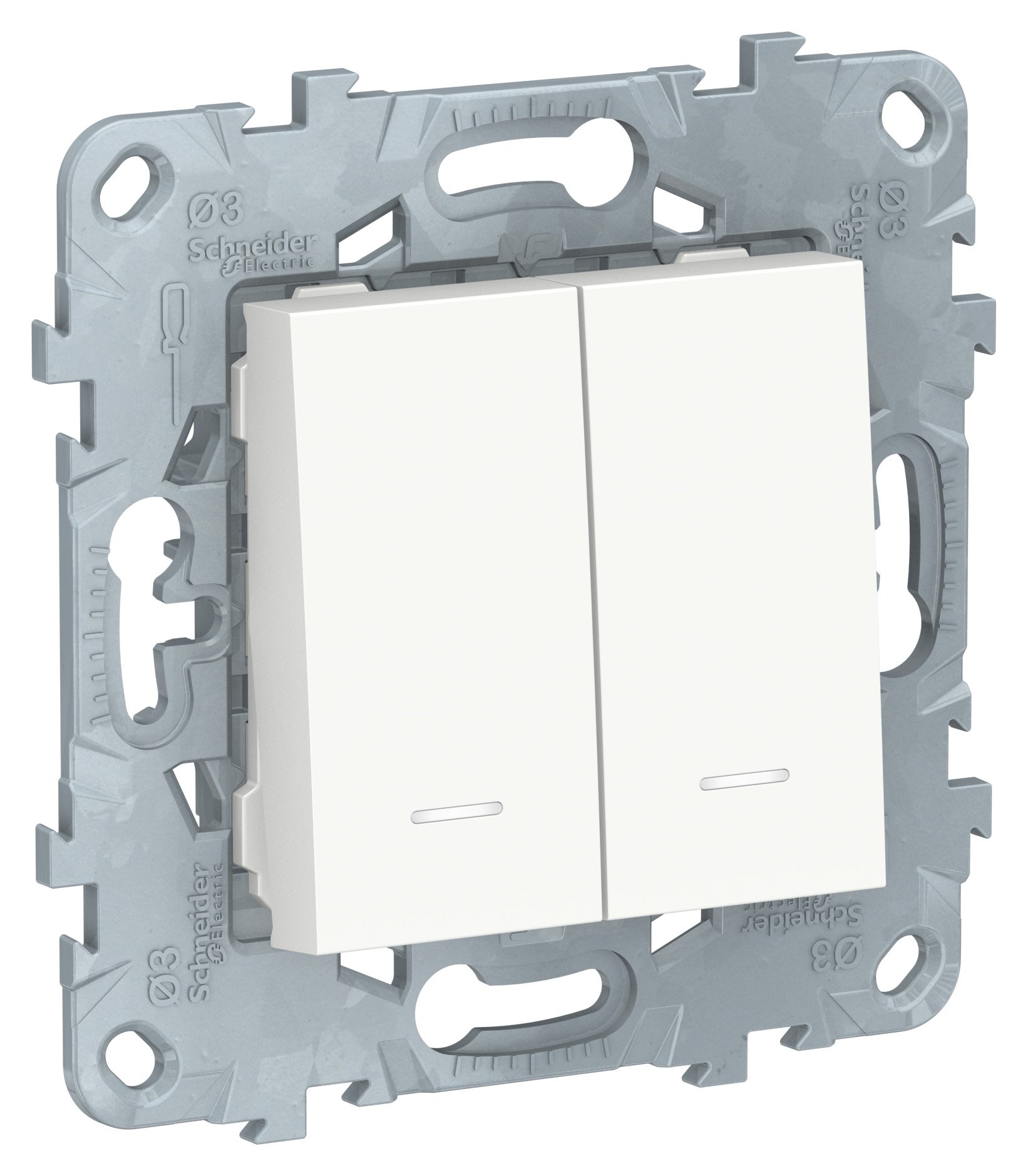 Выключатель двухклавишный Schneider Electric UNICA NEW (белый) с подсветкой предназначен для сетей до 250 В на ток до 10 А.