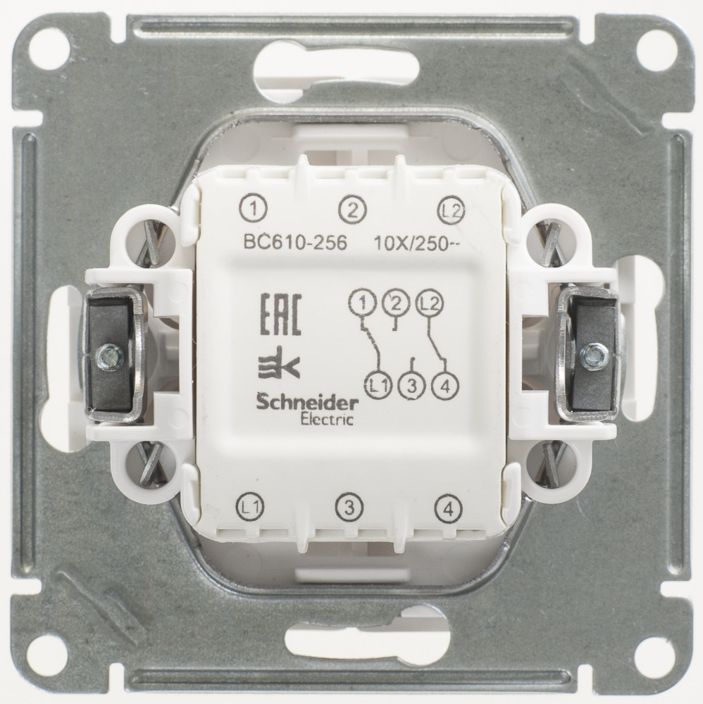Механизм Systeme Electric (ранее Schneider Electric) W59 (цвет белый) переключателя 2-клавишного с подсветкой подходит для сетей 250 В, на ток до 10 А.