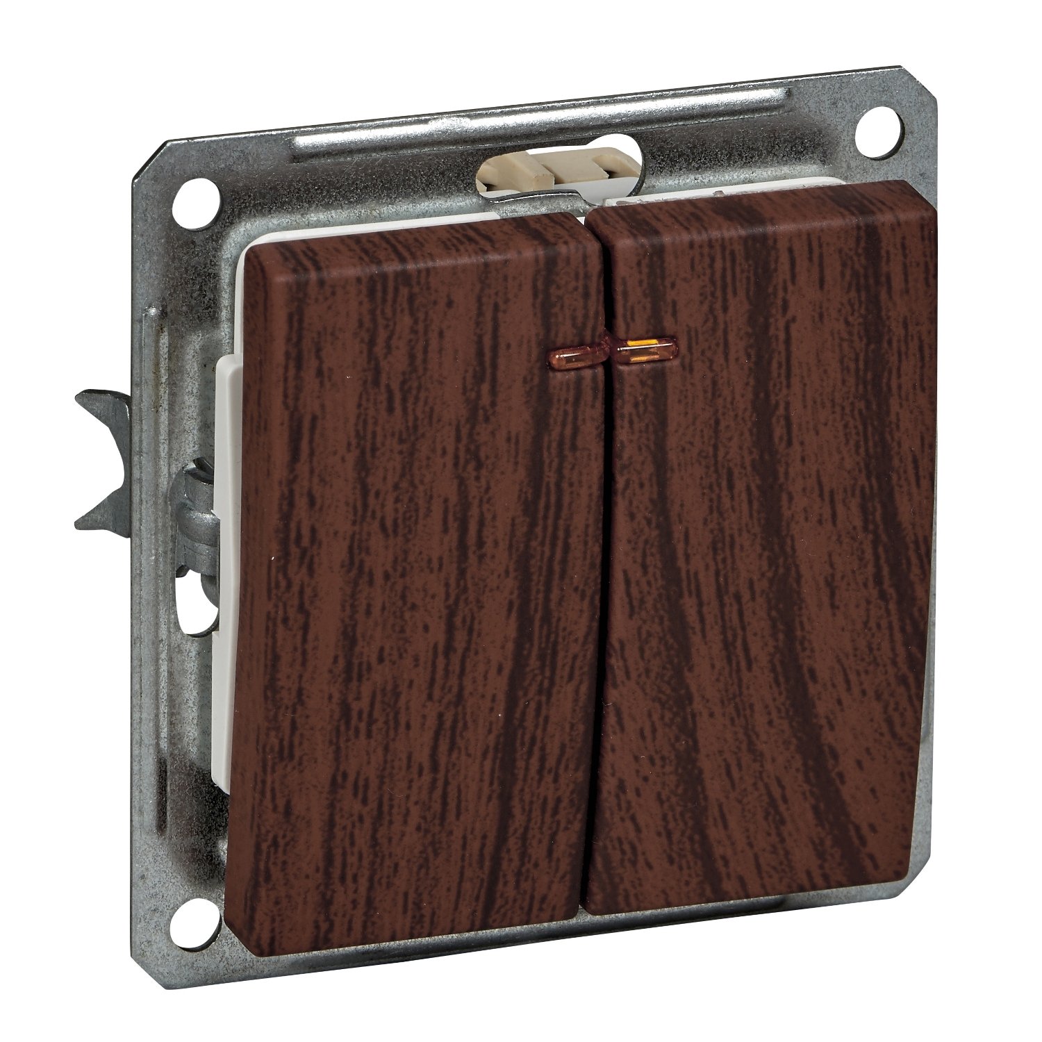 Механизм Schneider Electric W59 (цвет морёный дуб) выключателя 2-клавишного с подсветкой подходит для сетей 250 В, на ток до 16 А.