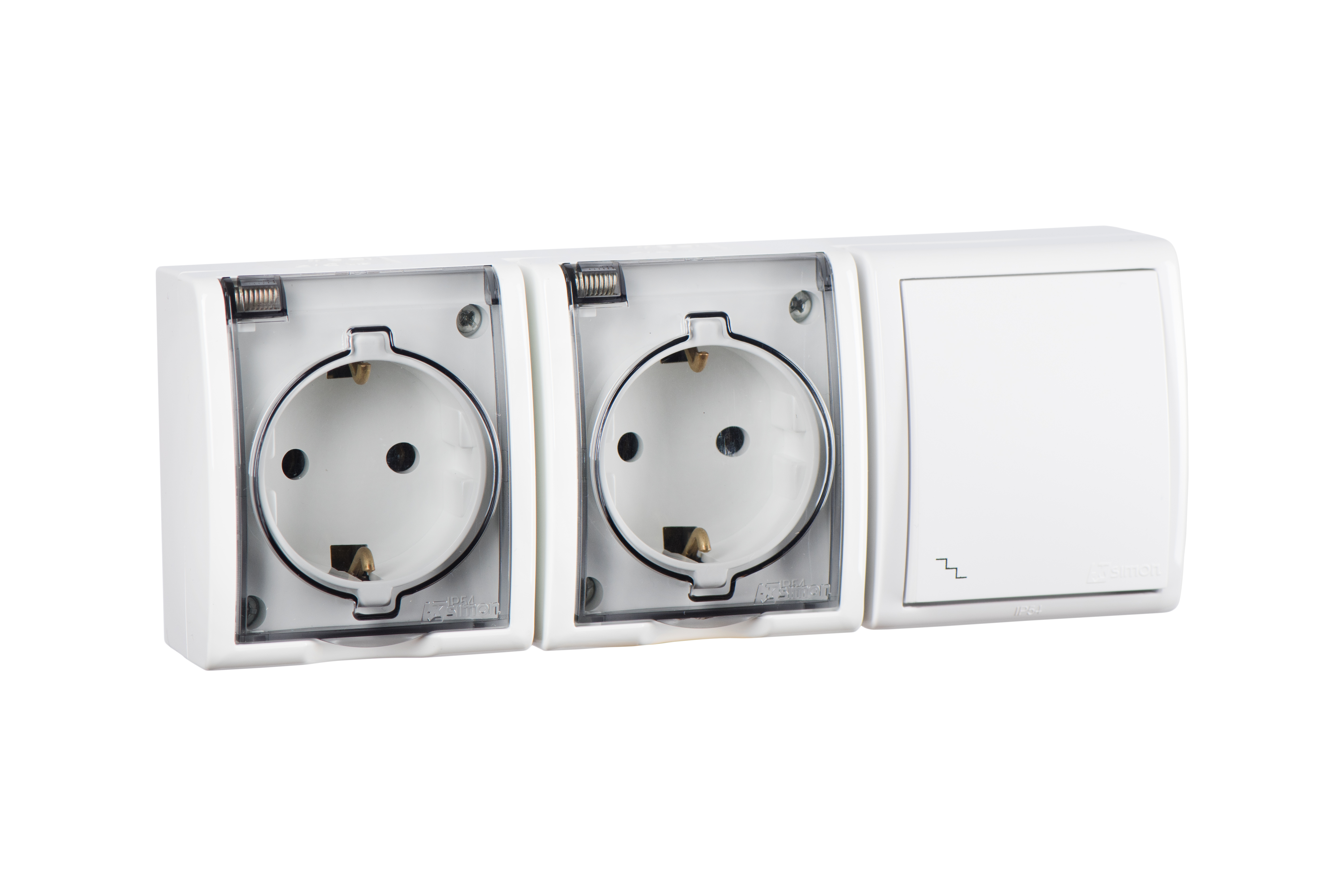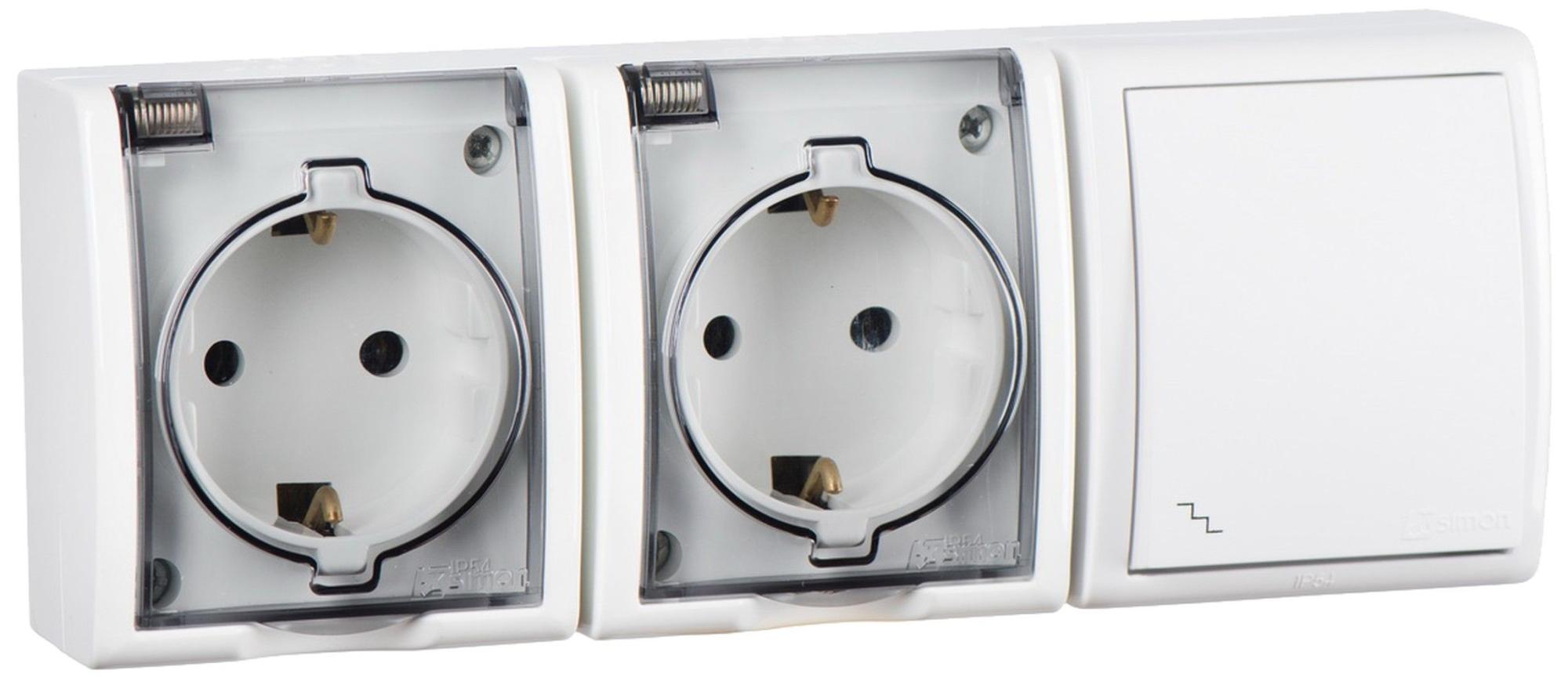 Simon 15 Aqua Белый Блок: Розетка 2-ая, 2P+E Schuko 16А 250В + выключатель проходной 10А 250В, IP54 от производителя Simon. Артикул производителя 1594526-030.