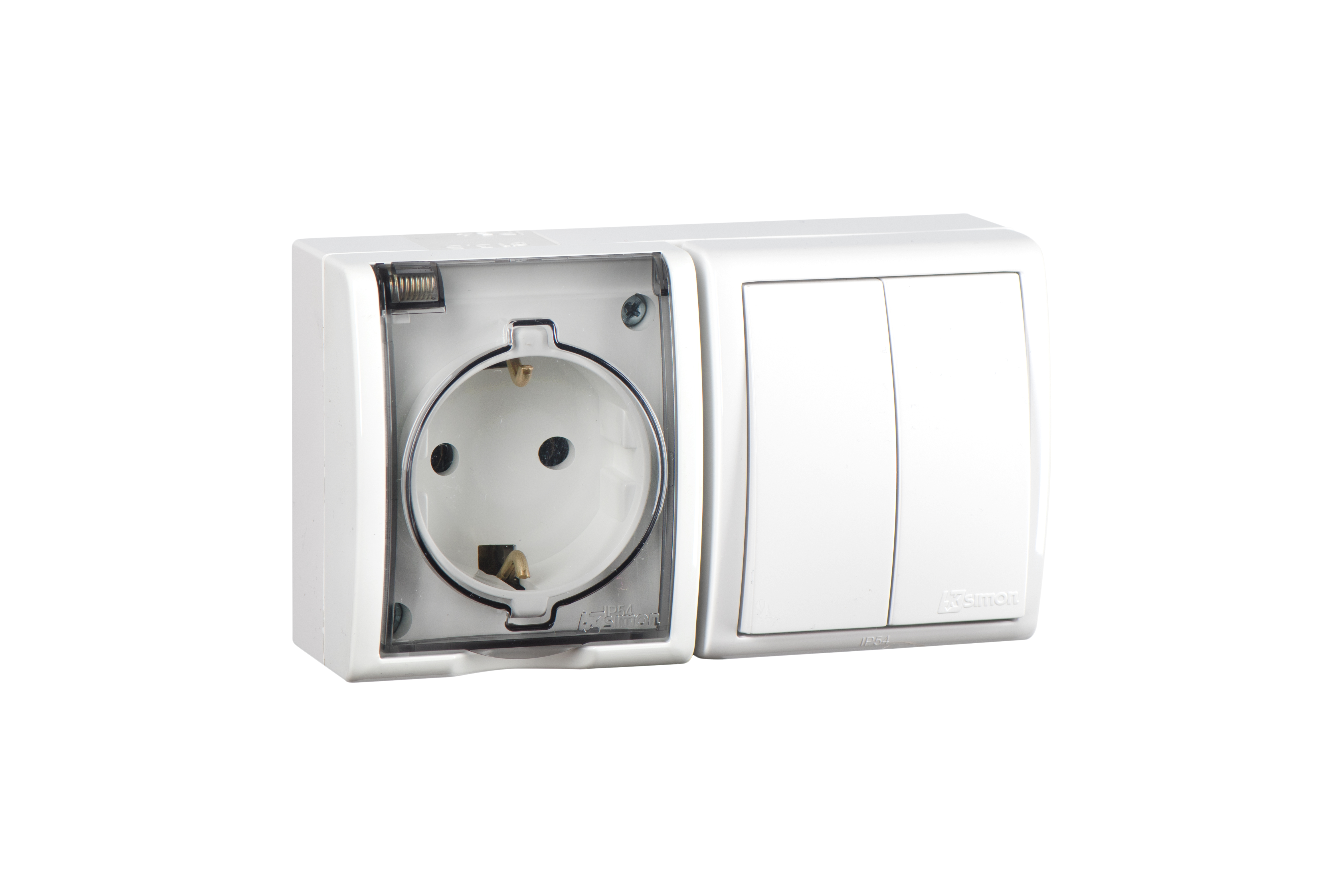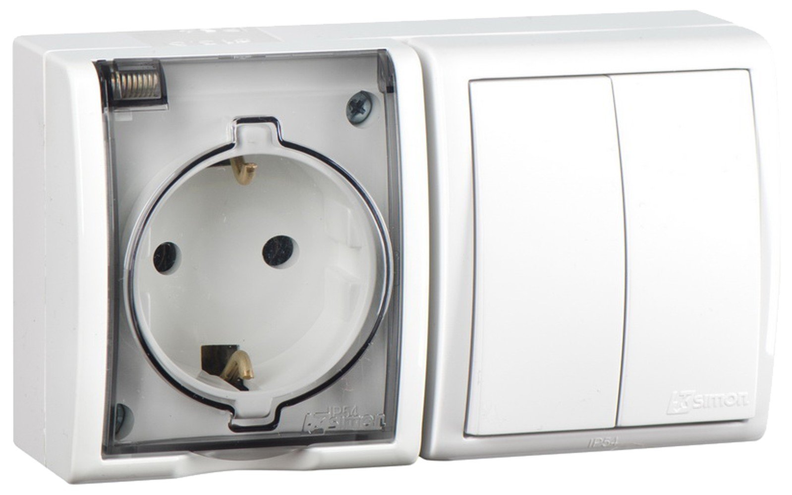 Simon 15 Aqua Белый Блок: Розетка 2P+E Schuko 16А 250В + выключатель двойной 10А 250В, IP54 от производителя Simon. Артикул производителя 1594515-030.