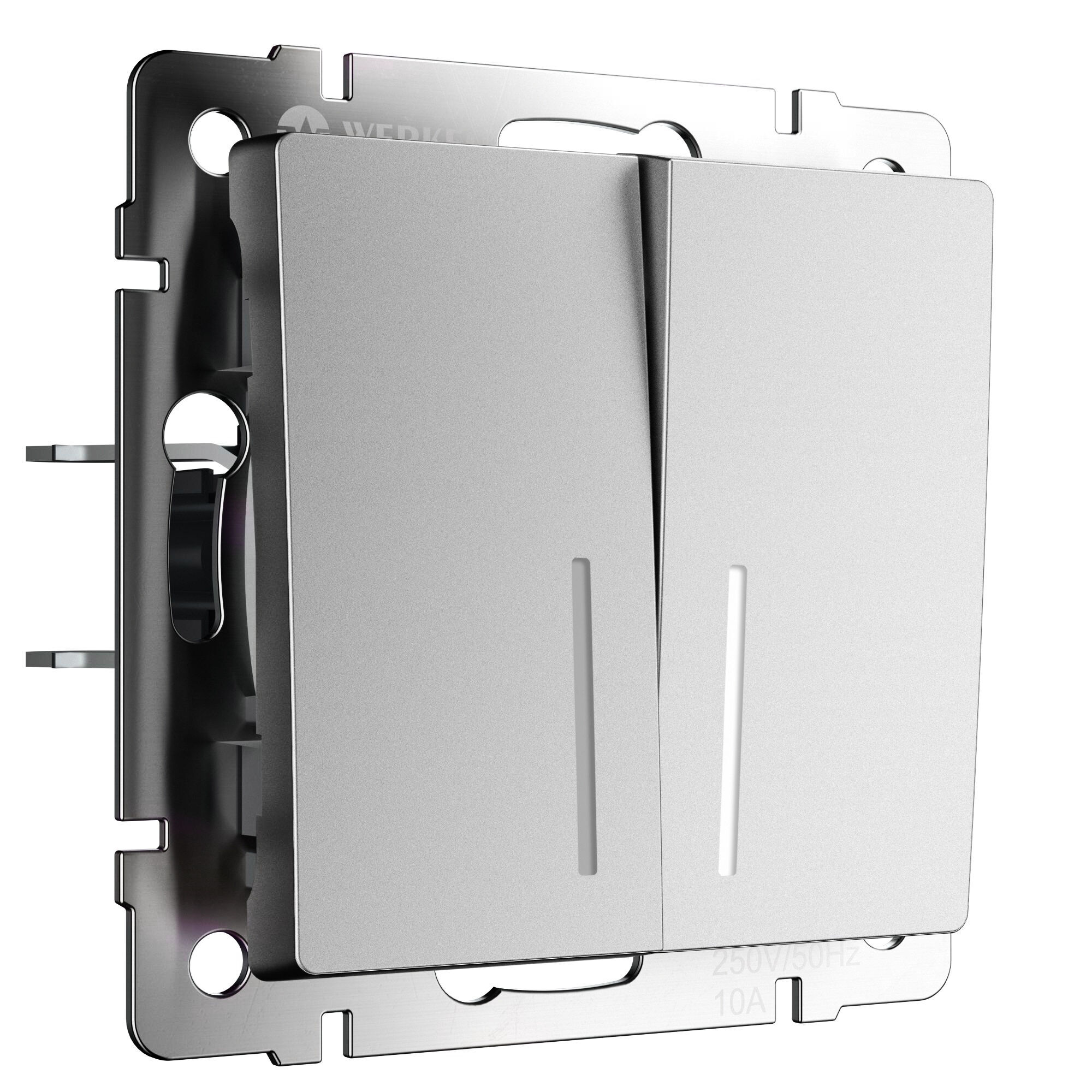 <p>Механизм двухклавишного выключателя с подсветкой оснащен матовой лицевой панелью. Матовая поверхность – это современный тренд, задающий стиль вашему интерьеру. Она не бликует, обладает бархатистой фактурой и тактильной мягкостью. Серебряный цвет будет эффектно смотреться в любом интерьерном пространстве и гармонично сочетаться с любыми материалами.</p> <p>Белая светодиодная подсветка с мягким свечением обозначит механизм и поможет ориентироваться в помещении в темное время суток.</p> <p>Механизм выключателя оснащен качественной контактной группой из фосфорной бронзы и технического серебра (90% серебра, 10% никеля), которая выдерживает большую нагрузку и обладает большим сроком службы.</p> <p>Суппорт из нержавеющей стали позволяет надежно зафиксировать изделие в подрозетнике. Механизм с суппортом из нержавеющей стали устанавливается в стандартную монтажную коробку и надежно фиксируется с помощью винтов и распорных лапок. Декоративные рамки легко устанавливаются и надежно фиксируются на суппорте при помощи клипс Easy Click.</p> <p>Механизмы с матовыми накладками комбинируются с любыми рамками Werkel. Совместимость дает большой простор в создании множества уникальных сочетаний.</p>